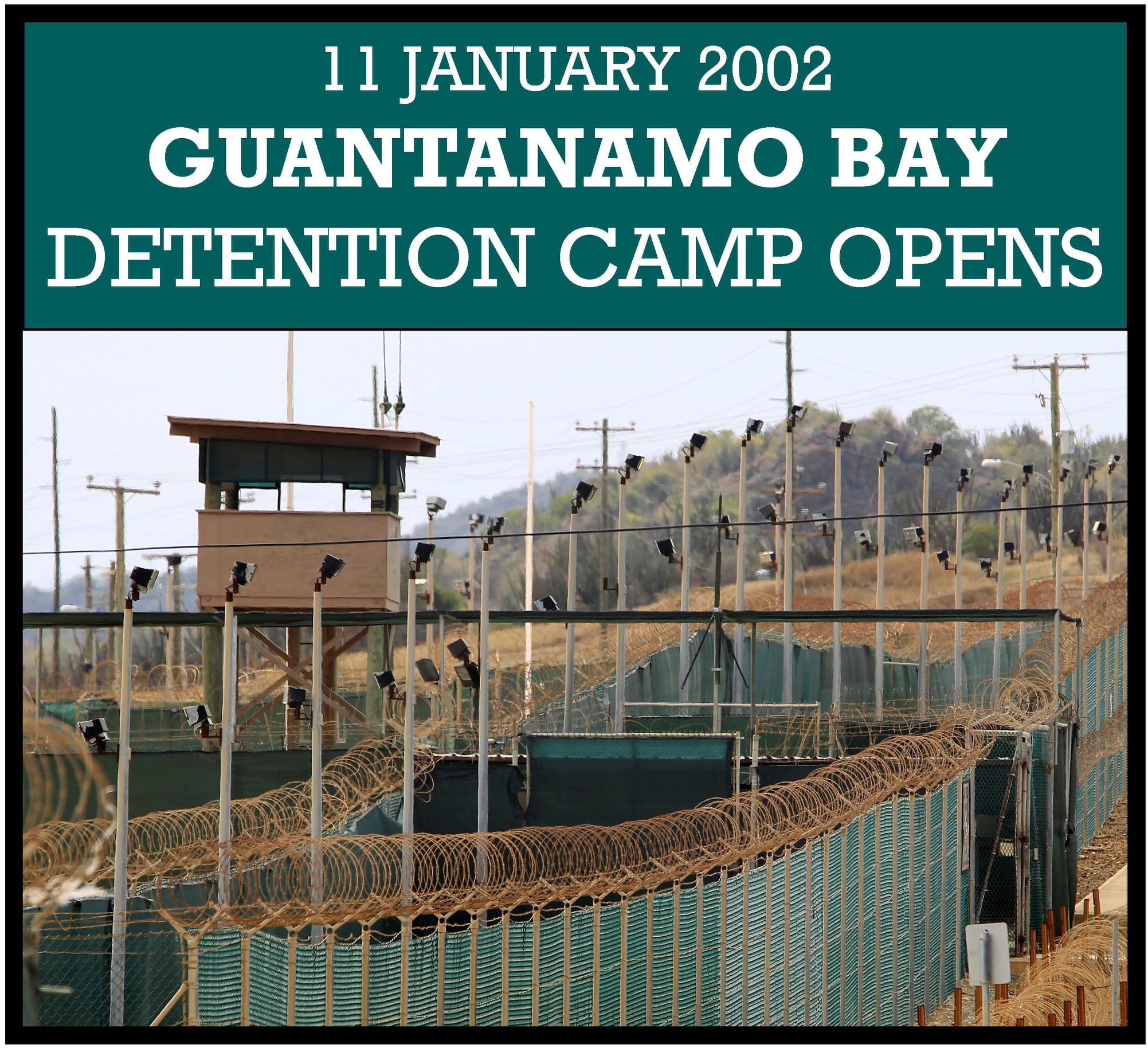 11 JANUARY 2002 – The Guantanamo Bay detention camp (Spanish: Centro de detención de la bahÃa de Guantánamo) is a United States military prison located within Guantanamo Bay Naval Base, also referred to as Guantánamo, GTMO, and Gitmo, on the coast of Guantánamo Bay in Cuba. Of the 780 people detained there since January 2002 when the military prison first opened after the September 11, 2001 attacks, 731 have been transferred elsewhere, 39 remain there, and 9 have died while in custody.