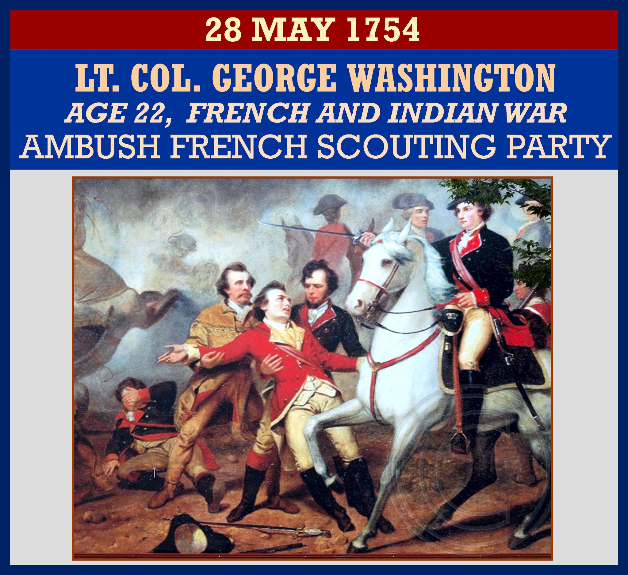 1754 â In the first engagement of the French and Indian War, a Virginia militia under 22-year-old Lieutenant Colonel George Washington defeats a French reconnaissance party in southwestern Pennsylvania. In a surprise attack, the Virginians killed 10 French soldiers from Fort Duquesne, including the French commander, Coulon de Jumonville, and took 21 prisoners. Only one of Washingtonâs men was killed. The French and Indian War was the last and most important of a series of colonial conflicts between the British and the American colonists on one side, and the French and their broad network of Native American allies on the other. Fighting began in the spring of 1754, but Britain and France did not officially declare war against each other until May 1756 and the outbreak of the Seven Years War in Europe.