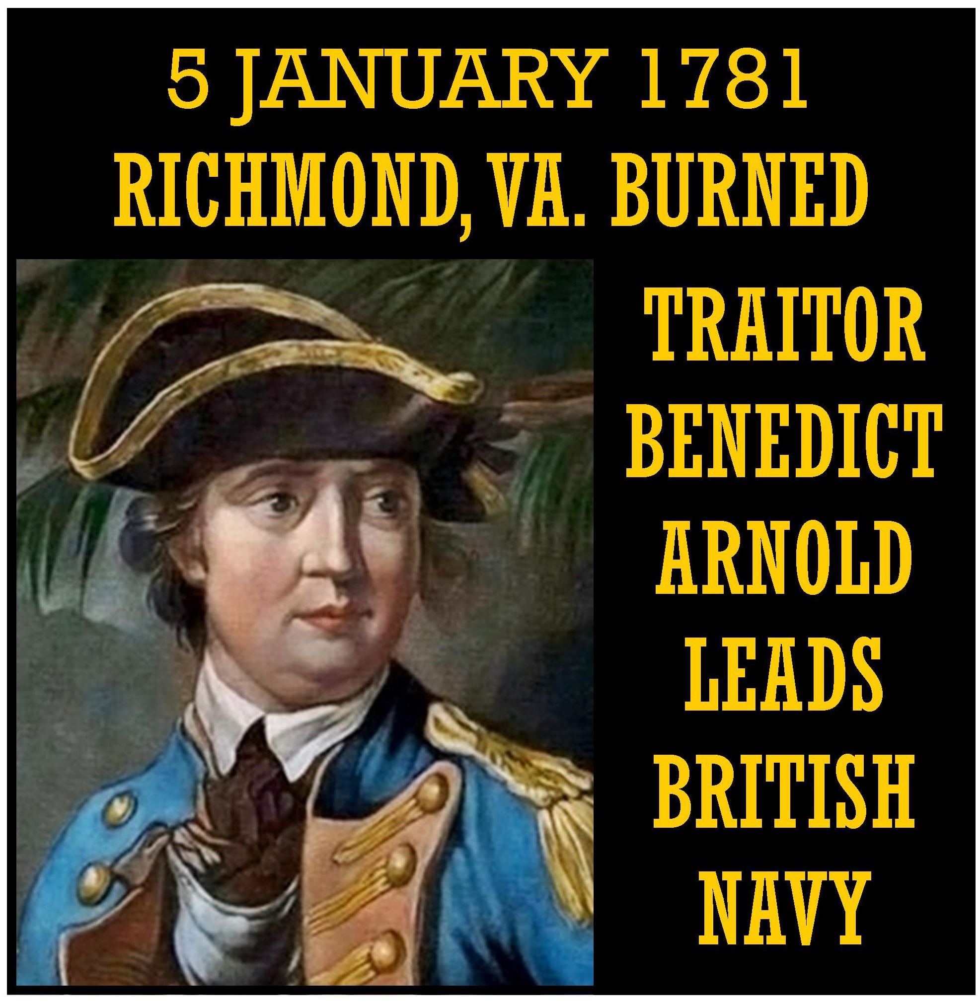 1781 â A British naval expedition led by Benedict Arnold burned Richmond, Va., causing Governor Thomas Jefferson to flee as the Virginia militia, led by Sampson Mathews, defended the city. It was Arnoldâs greatest success as a British commander. After the war, Benedict Arnold attempted and failed to establish businesses in Canada and London. He died a pauper on June 14, 1801, and lays buried in his Continental Army uniform at St. Maryâs Church, Middlesex, London. To this day, his name remains synonymous with the word âtraitorâ in the United States. rochestermilitary.com
