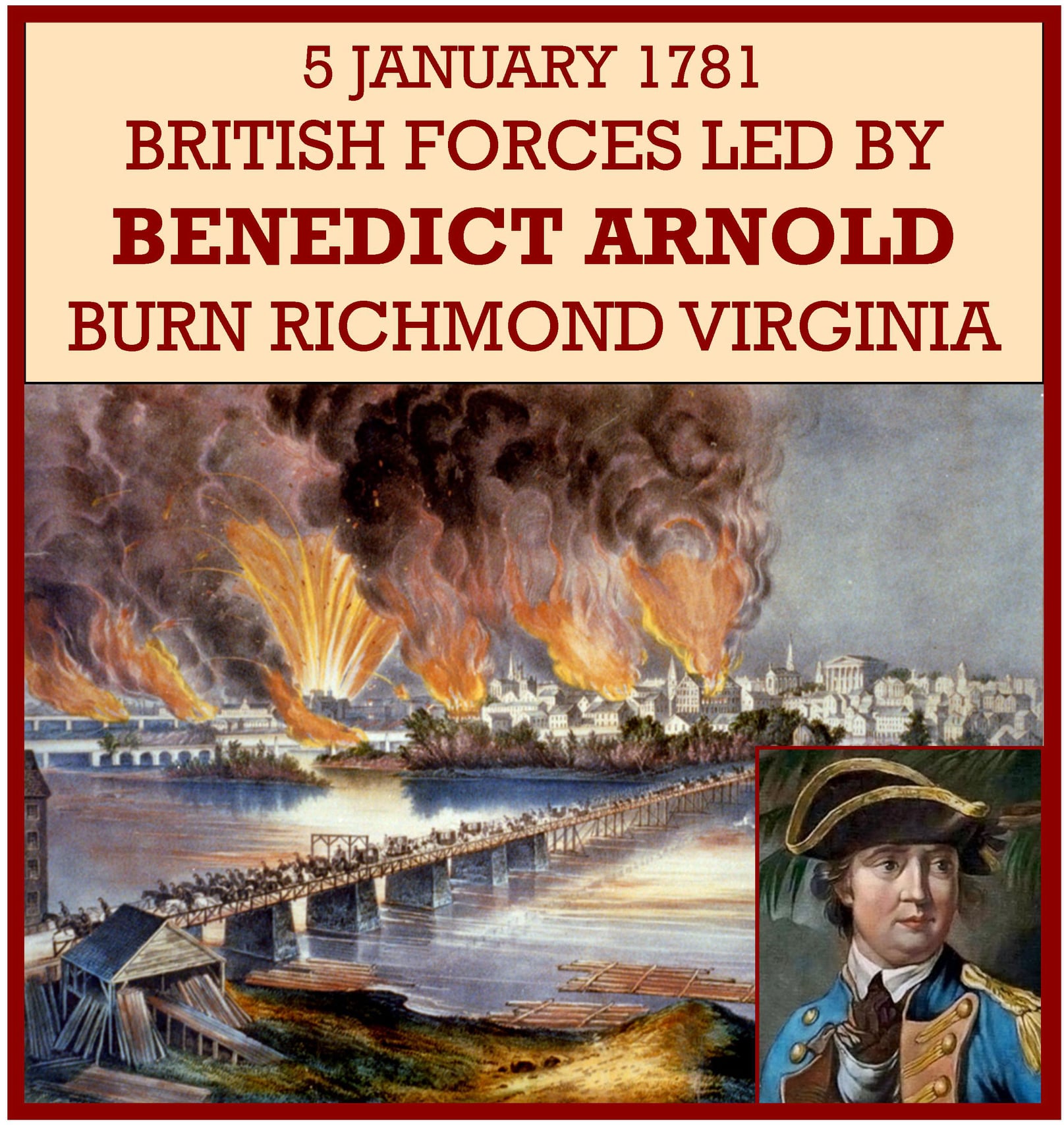 1781 – A British naval expedition led by Benedict Arnold burned Richmond, Va., causing Governor Thomas Jefferson to flee as the Virginia militia, led by Sampson Mathews, defended the city. It was Arnold’s greatest success as a British commander. Arnold’s 1,600 largely Loyalist troops sailed up the James River at the beginning of January, eventually landing in Westover, Virginia. Leaving Westover on the afternoon of January 4, Arnold and his men arrived at the virtually undefended capital city of Richmond the next afternoon. Virginia’s governor, Thomas Jefferson, had frantically attempted to prepare the city for attack by moving all arms & other Military Stores and records from the city to a foundry five miles outside Richmond. As news of Arnold’s unexpectedly rapid approach reached him, Jefferson then tried to orchestrate their removal to Westham, seven miles further north. He was too late–Arnold’s men quickly reached and burned the foundry and then proceeded towards Westham, which Jefferson had asked the formidable Prussian military advisor Baron Friedrich Wilhelm von Steuben to guard. Finding von Steuben, Arnold chose to return to Richmond, burning much of the city the following morning. Only 200 militiamen responded to Governor Jefferson’s call to defend the capital–most Virginians had already served and therefore thought they were under no further obligation to answer such calls. Despite this untenable military position, the author of the Declaration of Independence was criticized by some for fleeing Richmond during the crisis. Later, two months after Cornwallis surrendered at Yorktown, he was cleared of any wrongdoing during his term as governor. Jefferson went on to become the leader of the Democratic-Republican Party, and his presidential victory over the Federalists is remembered as The Revolution of 1800. After the war, Benedict Arnold attempted and failed to establish businesses in Canada and London. He died a pauper on June 14, 1801, and lays buried in his Continental Army uniform at St. Mary’s Church, Middlesex, London. To this day, his name remains synonymous with the word “traitor” in the United States.