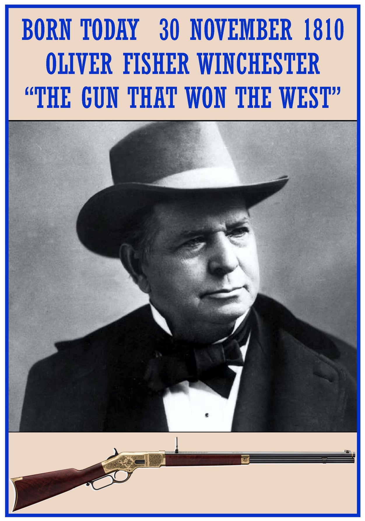 1810 â Oliver Fisher Winchester, rifle maker, was born. Winchester began his career as a clothing manufacturer. He opened a store in Baltimore making and selling shirts (1837), before moving to New York (1847) where he took on a partner. Winchester patented a new method or manufacturing menâs shirts, and opened a factory in nearby New Haven, Conn. In 1850. He invested his profits from the factory into Volcanic Repeating Arms Company, becoming principal shareholder and president by 1856. Under his leadership, the company acquired rights to manufacture pistols and rifles patented by Tyler Henry and others. The repeating rifle was in full production by 1860, and was in heavy demand during the Civil War, during which Winchester continued to improve the rifleâs design by acquiring other patents. He renamed the company the Winchester Repeating Arms Company in 1866. A political and philanthropic figure, he was lieutenant governor of Connecticut (1866â67) and made large donations to Yale. rochestermilitary.com