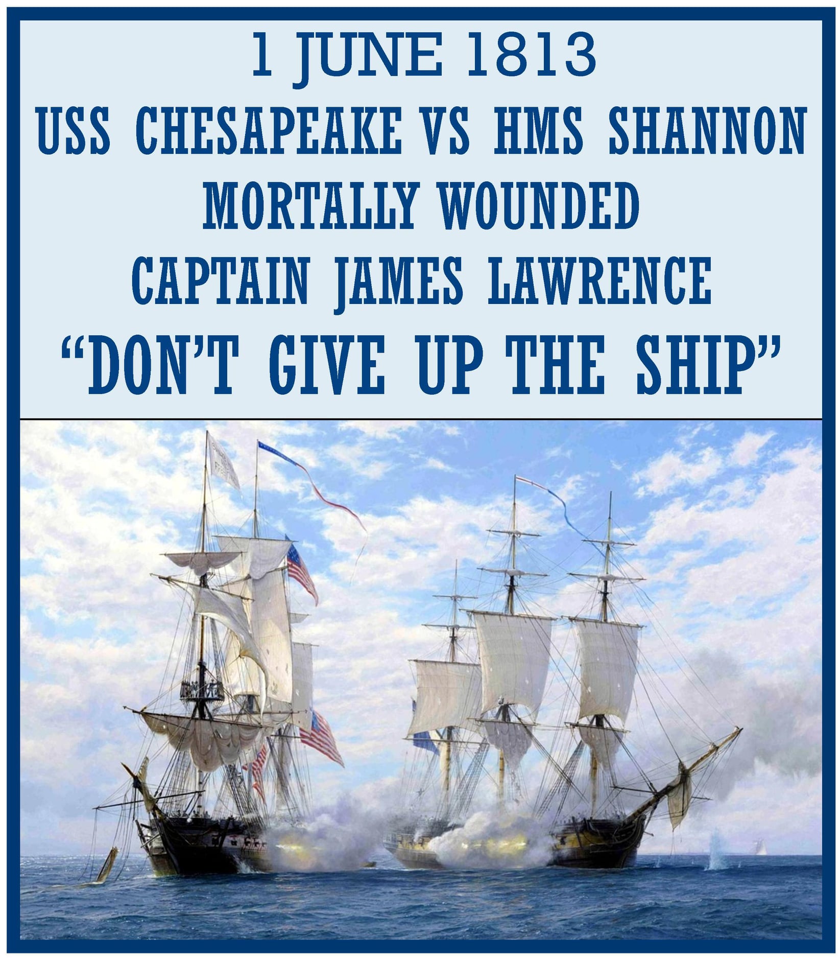 1813 â The U.S. Navy gained its motto as the mortally wounded commander of the U.S. frigate âChesapeakeâ, Captain James Lawrence (b.1871) was heard to say, âDonât give up the ship!â, during a losing battle with a British frigate âShannonâ; his ship was captured by the British frigate. Oliver Hazard Perry honored his dead friend Lawrence when he had the motto sewn onto the private battle flag flown during the Battle of Lake Erie, 10 September 1813.