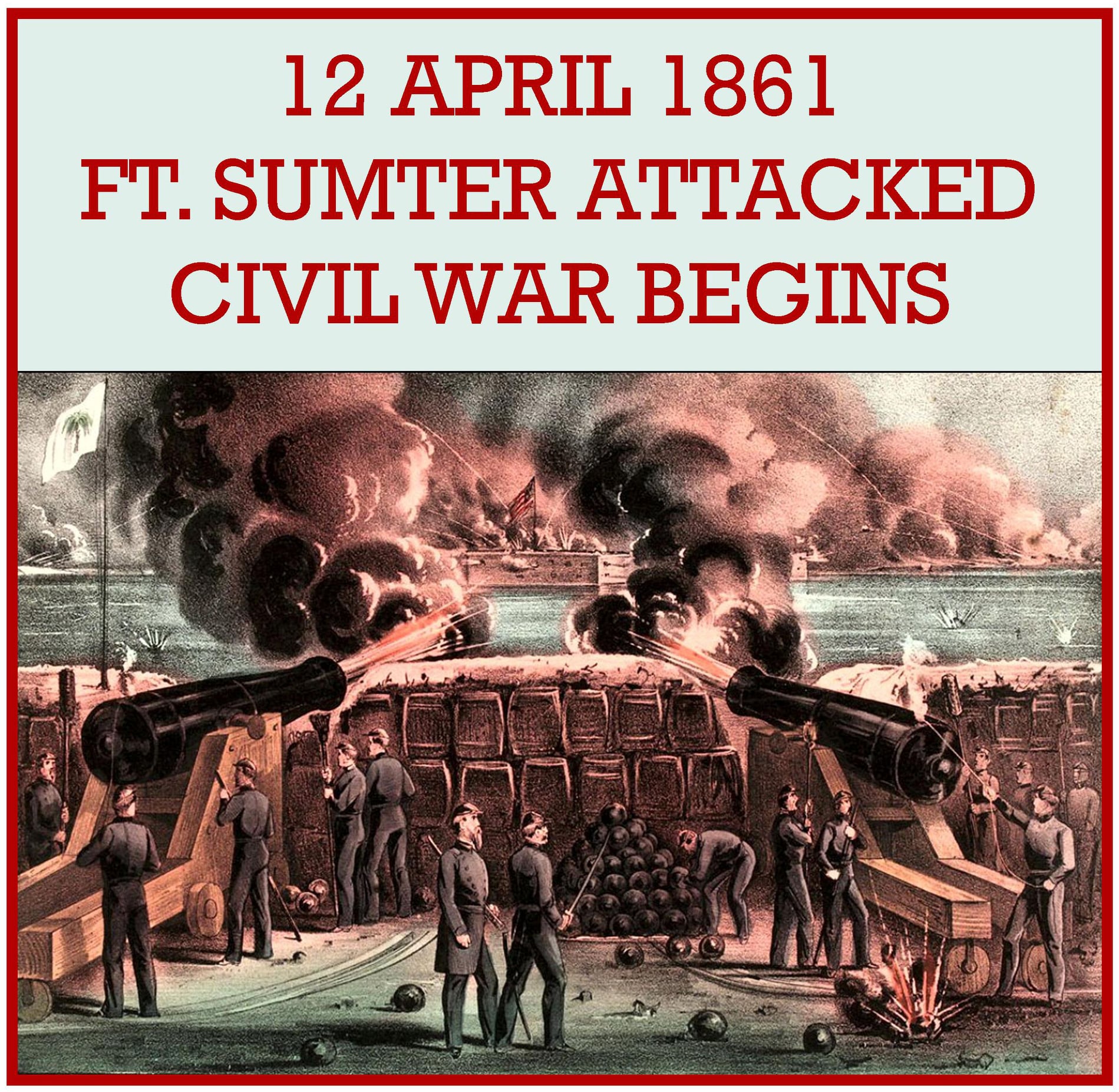 1861 â The American Civil War begins when Confederates fire on Fort Sumter in Charleston Harbor. The fort had been the source of tension between the Union and Confederacy for several months. After South Carolina seceded, the state demanded the fort be turned over but Union officials refused. A supply ship, the âStar of the West,â tried to reach Fort Sumter on January 9, but the shore batteries opened fire and drove it away. For both sides, Sumter was a symbol of sovereignty. The Union could not allow it to fall to the Confederates, although throughout the Deep South other federal installations had been seized. For South Carolinians, secession meant little if the Yankees still held the stronghold. The issue hung in the air when Abraham Lincoln took the oath of office on March 4, stating in his inauguration address: âYou can have no conflict without being yourselves the aggressors.â Lincoln did not try to send reinforcements but he did send in food. This way, Lincoln could characterize the operation as a humanitarian mission, bringing, in his words, âfood for hungry men.â He sent word to the Confederates in Charleston of his intentions on April 6. The Confederate Congress at Montgomery, Alabama, had decided on February 15 that Sumter and other forts must be acquired âeither by negotiation or force.â Negotiation, it seemed, had failed. The Confederates demanded surrender of the fort, but Major Robert Anderson, commander of Fort Sumter, refused. At 4:30 a.m. on April 12, the Confederate guns opened fire. For thirty-three hours, the shore batteries lobbed 4,000 shells in the direction of the fort. Finally, the garrison inside the battered fort raised the white flag. No one on either side had been killed, although two Union soldiers died when the departing soldiers fired a gun salute, and some cartridges exploded prematurely. It was a nearly bloodless beginning to Americaâs bloodiest war.
