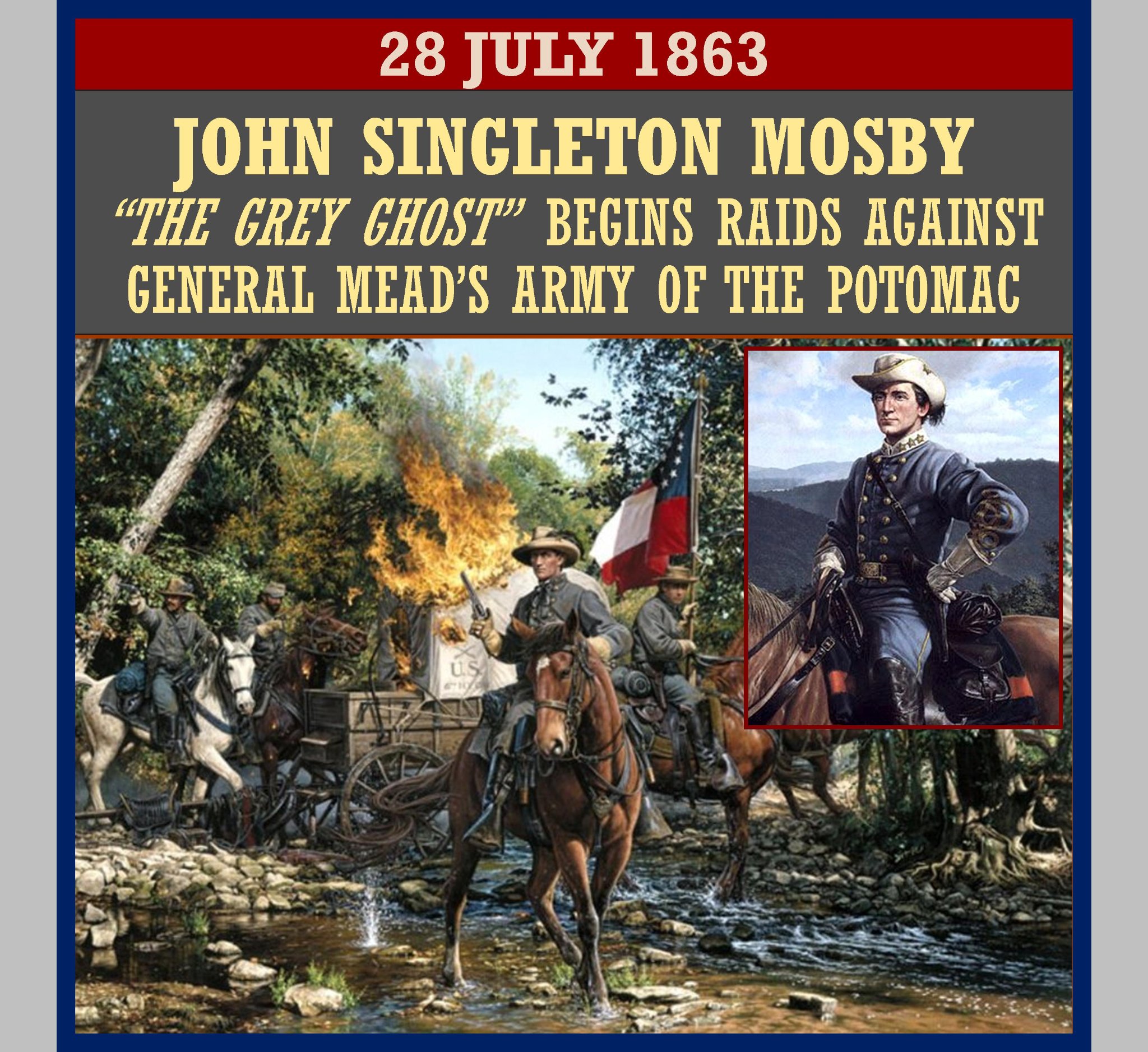1863 â Confederate John Mosby began a series of attacks against General Meadeâs Army of the Potomac as it tried to pursue General Robert E. Lee in Virginiaâs Shenandoah Valley. Confederate Colonel John S. Mosby was known as âThe Gray Ghost.â The rather ordinary looking Mosby led his Partisan Rangers in guerilla warfare operations that continually confounded Union commanders in the Piedmont region of Virginia.