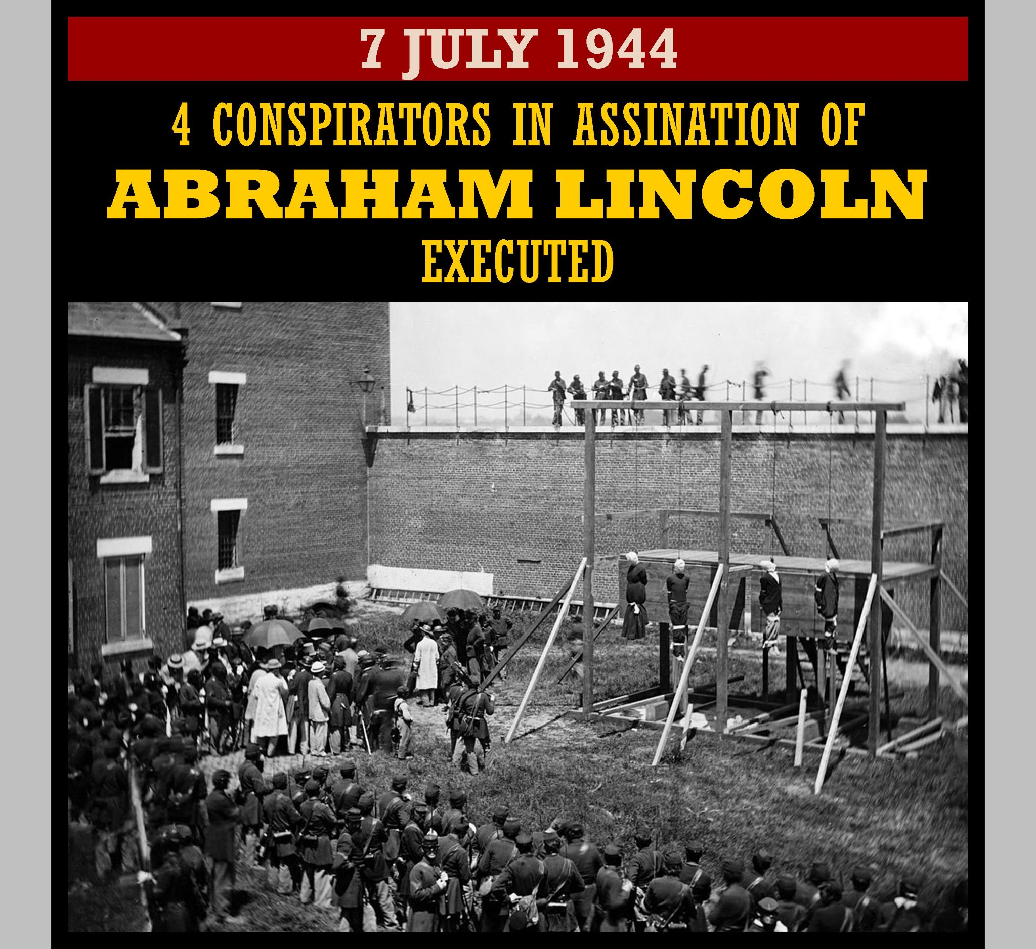 1865 â The trap doors of the scaffold in the yard of Washingtonâs Old Penitentiary were sprung, and Mary Surratt, Lewis Paine, David Herold and George Atzerodt dropped to their deaths. The four had been convicted of âtreasonable conspiracyâ in the assassination of President Abraham Lincoln, and had learned that they were to be hanged only a day before their execution. Shortly after 1 p.m. the prisoners were led onto the scaffold and prepared for execution. The props supporting the platform were knocked away at about 2 p.m. Assassin John Wilkes Booth had been killed on April 26, 12 days after Lincolnâs assassination. Other convicted conspiratorsâEdman Spangler, Dr. Samuel Mudd, Samuel Arnold and Michael OâLaughlinâwere imprisoned. Surratt was the first woman to be executed in the United States.