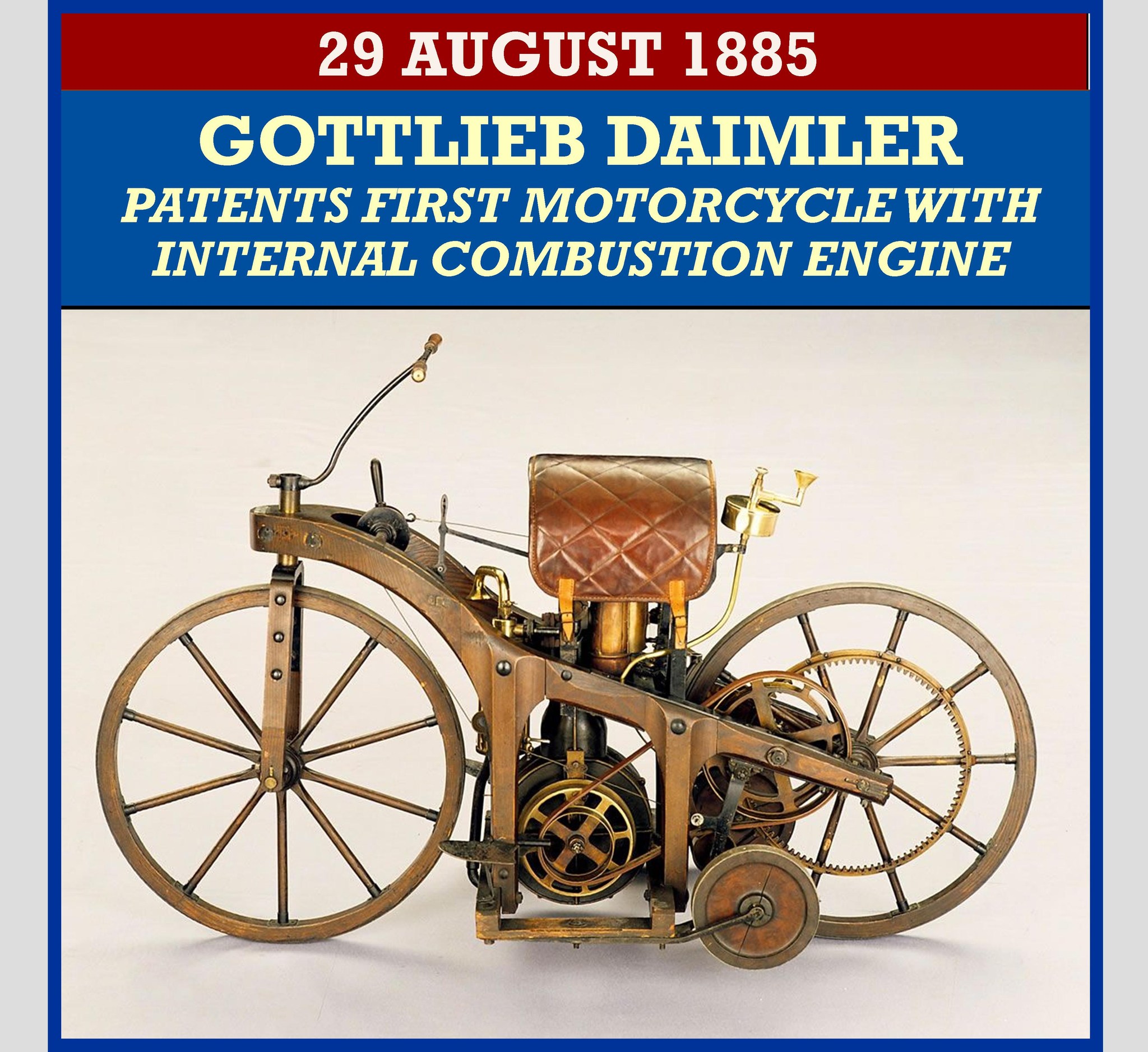 1885: Gottlieb Daimler patents what is generally considered to be the first true motorcycle.