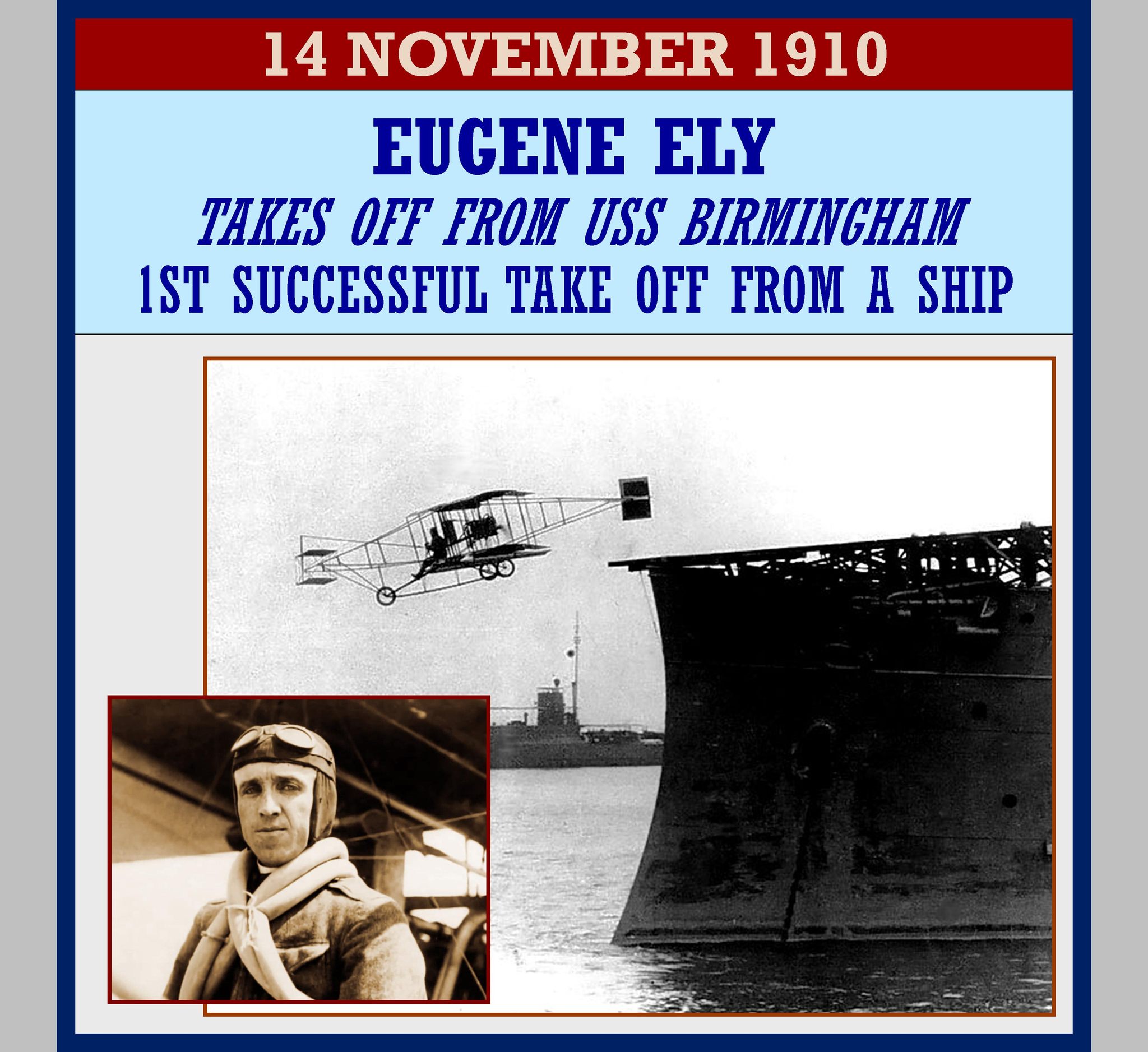 1910 – Civilian Eugene Ely, was the first to take off in an airplane from the deck of a ship, USS Birmingham (CL-2) . He flew from the Birmingham at Hampton Roads to Norfolk. It was a Curtiss plane flown by Eugene Ely, a company exhibition pilot, that made the first successful takeoff from a Navy ship.