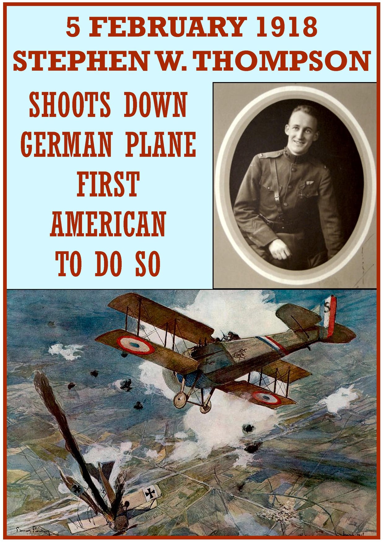 1918 â Stephen W. Thompson shoots down a German airplane. It is the first aerial victory by the U.S. military. His unit, the 1st Aero Squadron had not yet begun combat operations. Thompson visited a French unit with a fellow member of the 1st Aero Squadron and both were invited to fly as gunner-bombardiers with the French on a bombing raid over Saarbrücken, Germany. After they had dropped their bombs, the squadron was attacked by Albatros D.III fighters. Thompson shot down one of them. This was the first aerial victory by any member of the U.S. military. He was awarded the Croix de guerre with Palm for the action.