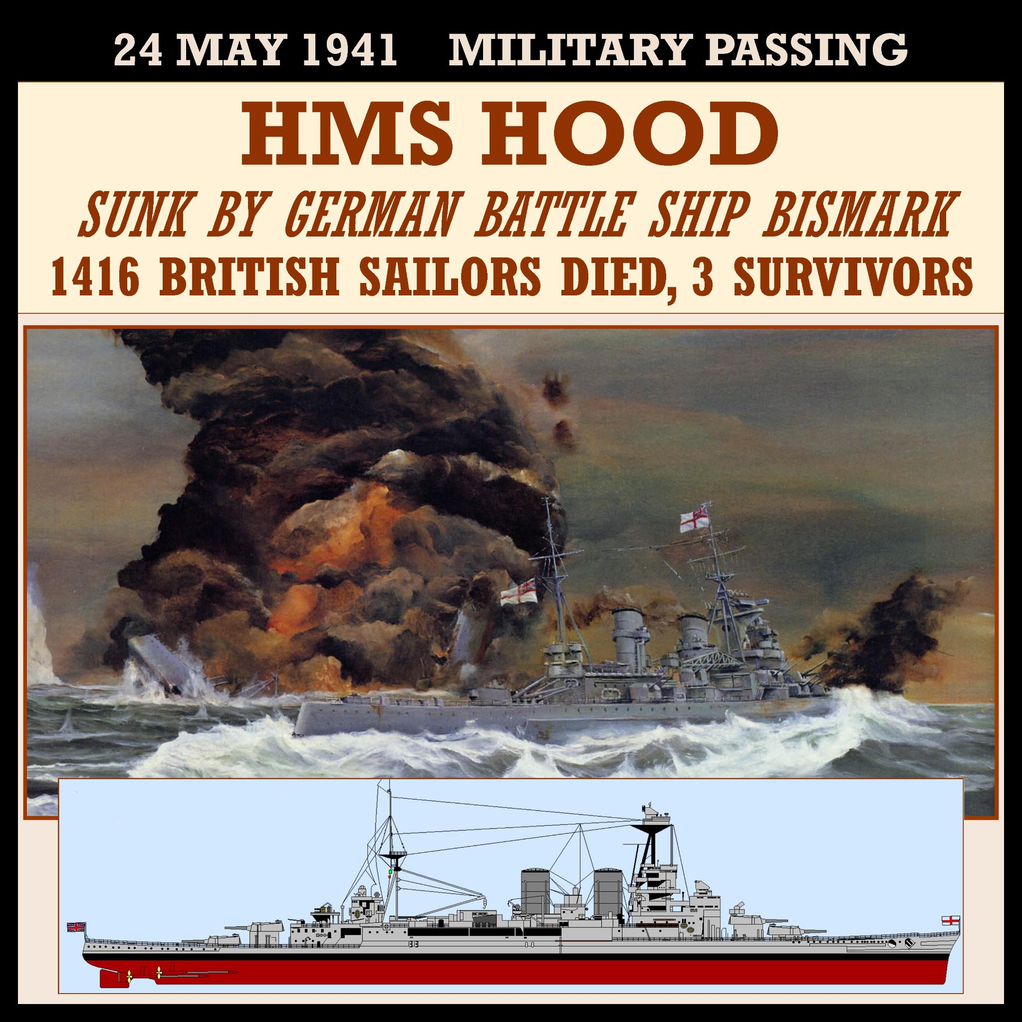 1941 â The German battleship Bismarck sank the British dreadnought HMS Hood in the North Atlantic. 1416 died with only three survivors. CGC Modoc sighted the German battleship SMS Bismarck while the cutter searched for survivors of a convoy southeast of Cape Farewell, Greenland. British Swordfish torpedo planes from the Royal Navy aircraft carrier HMS Victorious circled Modoc as they flew towards the German battleshipâs position. The Modocâs crew then spotted the flashes caused by anti-aircraft fire from the Bismarck and then sighted British warships on the opposite horizon. The cutter then maneuvered to avoid contact with any of the warships and managed to steam out of the area unscathed.