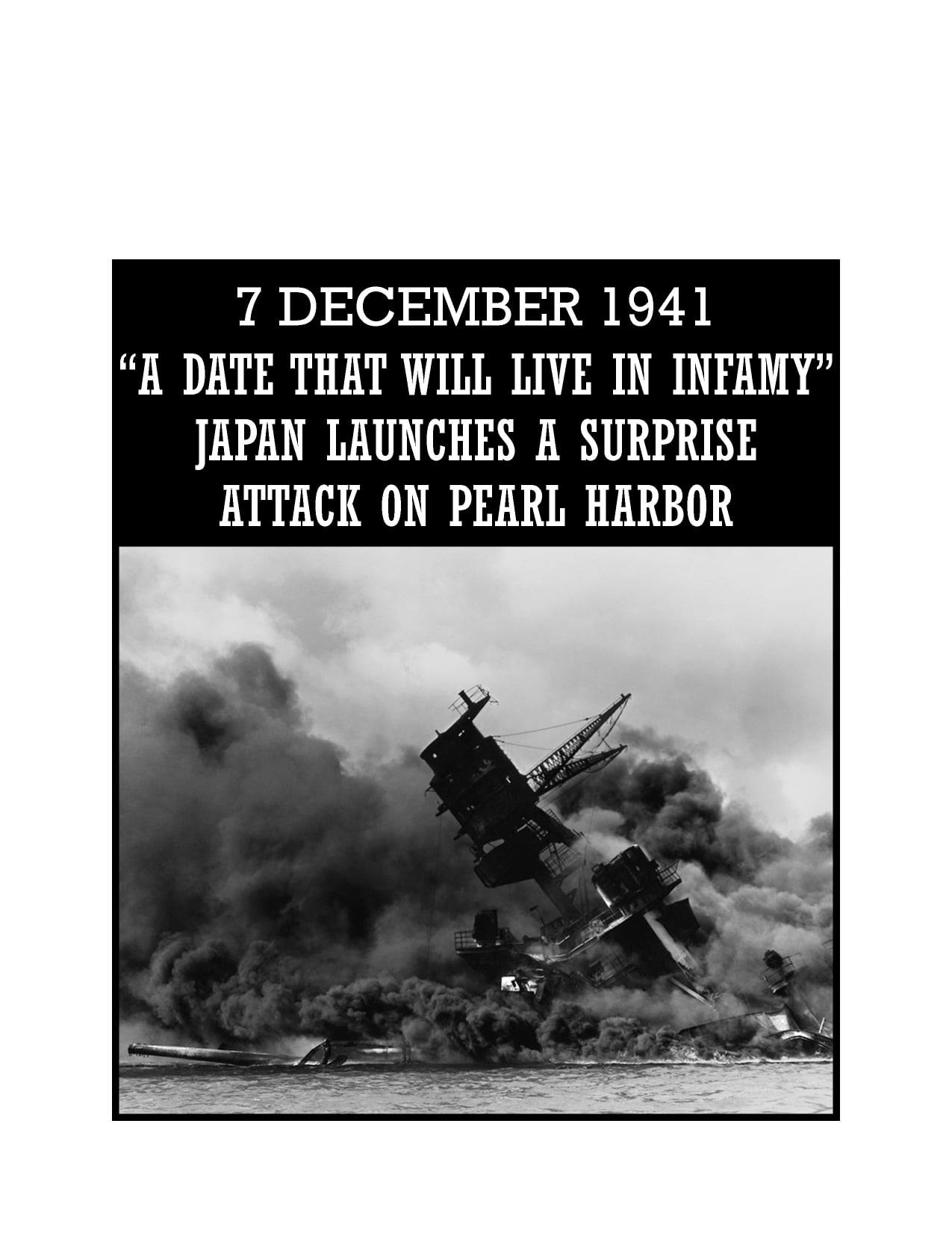 1941â The USS Arizona burns. At 7:55 a.m. Hawaii time, a Japanese dive bomber bearing the red symbol of the Rising Sun of Japan on its wings appears out of the clouds above the island of Oahu. A swarm of 360 Japanese warplanes followed, descending on the U.S. naval base at Pearl Harbor in a ferocious assault Five of eight battleships, three destroyers, and seven other ships were sunk or severely damaged, and more than 200 aircraft were destroyed. A total of 2,400 Americans were killed and 1,200 were wounded, many while valiantly attempting to repulse the attack. Japanâs losses were some 30 planes, five midget submarines, and fewer than 100 men. rochestermilitary.com
