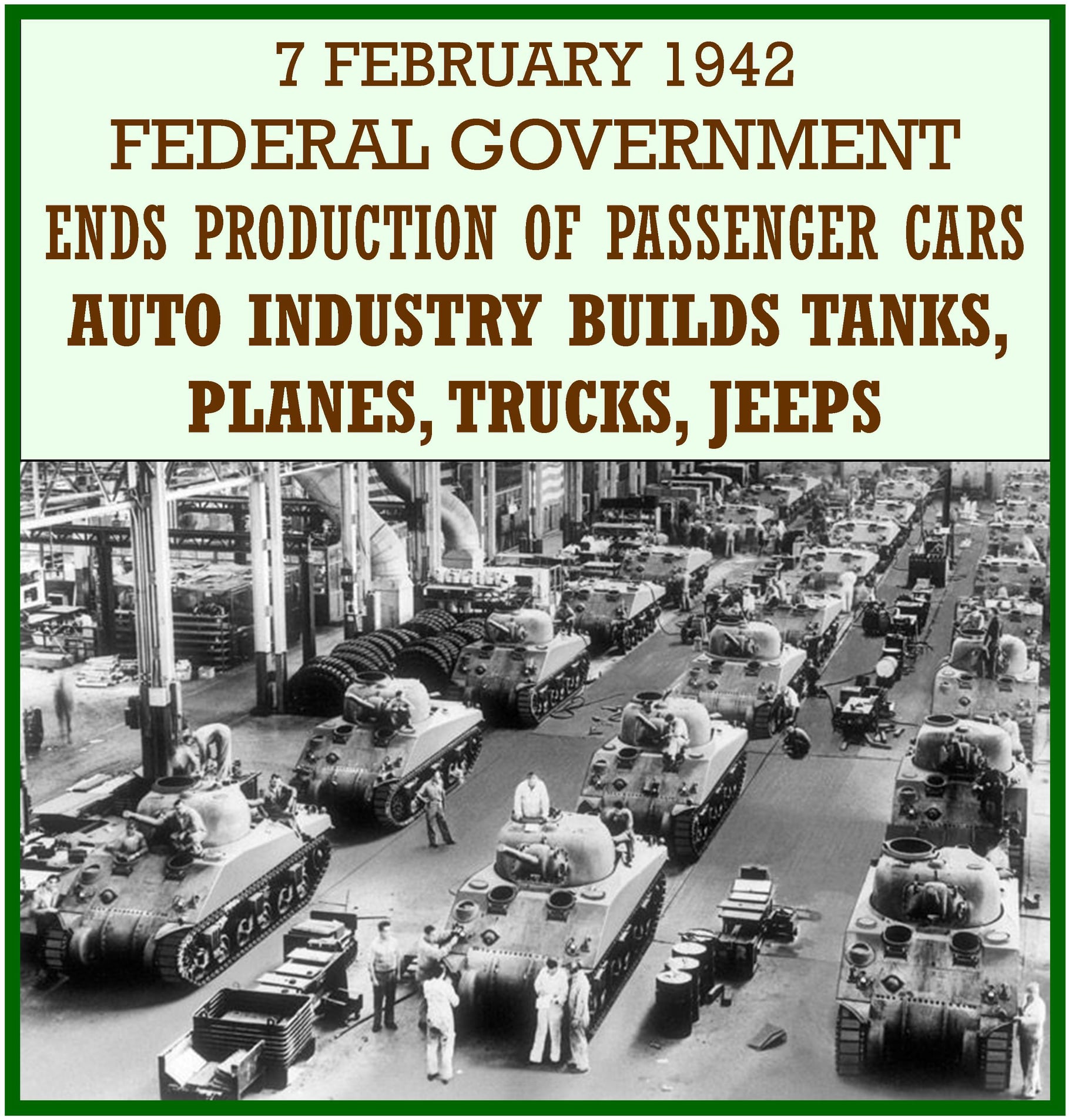 1942 â The federal government ordered passenger car production stopped and converted to wartime purposes. In spite of President Franklin D. Rooseveltâs exhortation that the U.S. auto industry should become the âgreat arsenal of democracy,â Detroitâs executives were reluctant to join the war cause. However, following the bombing of Pearl Harbor, the country mobilized behind the U.S. declaration of war. The government offered automakers guaranteed profits regardless of production costs throughout the war years. Furthermore, the Office of Production Management allocated $11 billion to the construction of war manufacturing plants that would be sold to the automobile manufacturers at remarkable discounts after the war. What had at first seemed like a burden on the automotive industry became a boon. The production demands placed on the industry and the resources allocated to the individual automobile manufacturers during the war would revolutionize American car making and bring about the Golden Era of the 1950s.