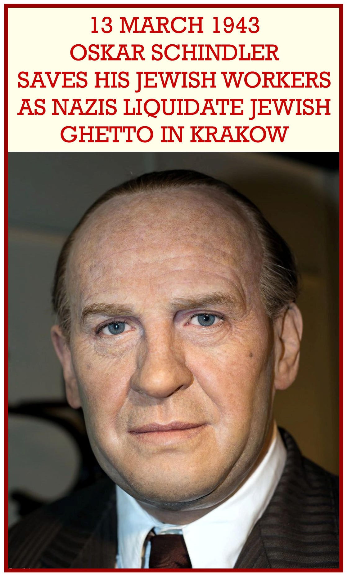 1943 Nazis liquidate the Jewish ghetto in Kraków; Oskar Schindler with advance information, saves his workers by keeping them in his factory overnight