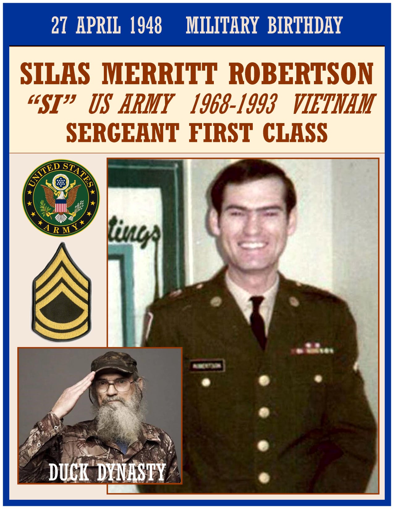 1948 Silas Merritt Robertson (born April 27, 1948), known as Si Robertson and often referred to as “Uncle Si”, is an American television personality, preacher, hunter, outdoorsman, retired U.S. Army soldier, and duck-call maker at Duck Commander.