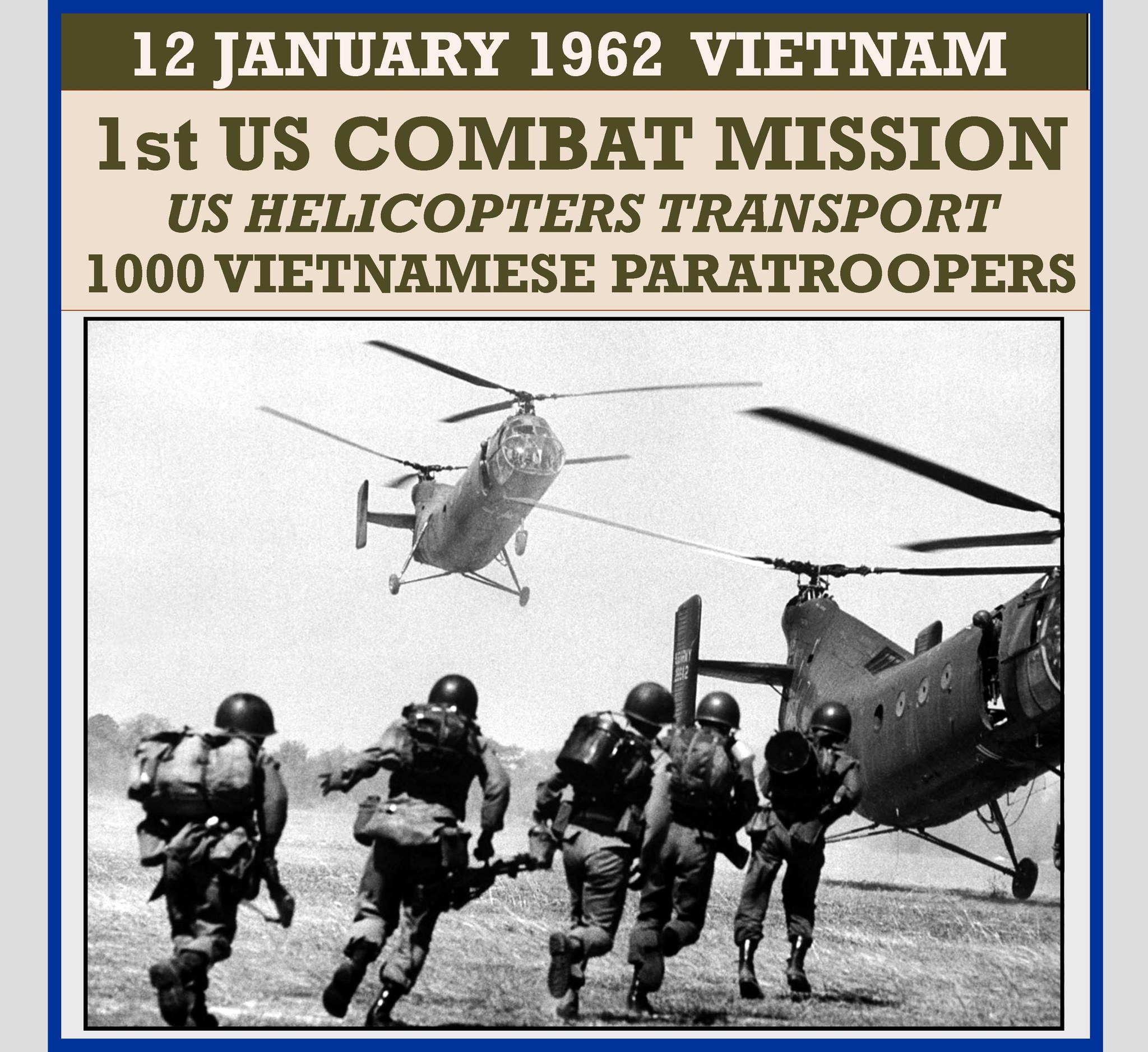 1962 â Operation Chopper, the first American combat mission in the Vietnam War, takes place. In December 1961, the USNS Core (T-AKV-41) docked in Saigon with 82 US Army Piasecki H-21 helicopters. A little more than 12 days later, Operation Chopper commenced. The helicopters transported over 1,000 South Vietnamese paratroopers for an assault on a suspected Viet Cong stronghold 10 miles west of Saigon. The Viet Cong were surprised and soundly defeated, but they gained valuable combat experience they would later use with great effect against US troops. The paratroopers also captured a sought-after underground radio transmitter. This operation heralded a new era of air mobility for the U.S. Army, which had been slowly growing as a concept since the Army formed twelve helicopter battalions in 1952 as a result of the Korean War. These new battalions eventually formed a sort of modern day cavalry for the Army.