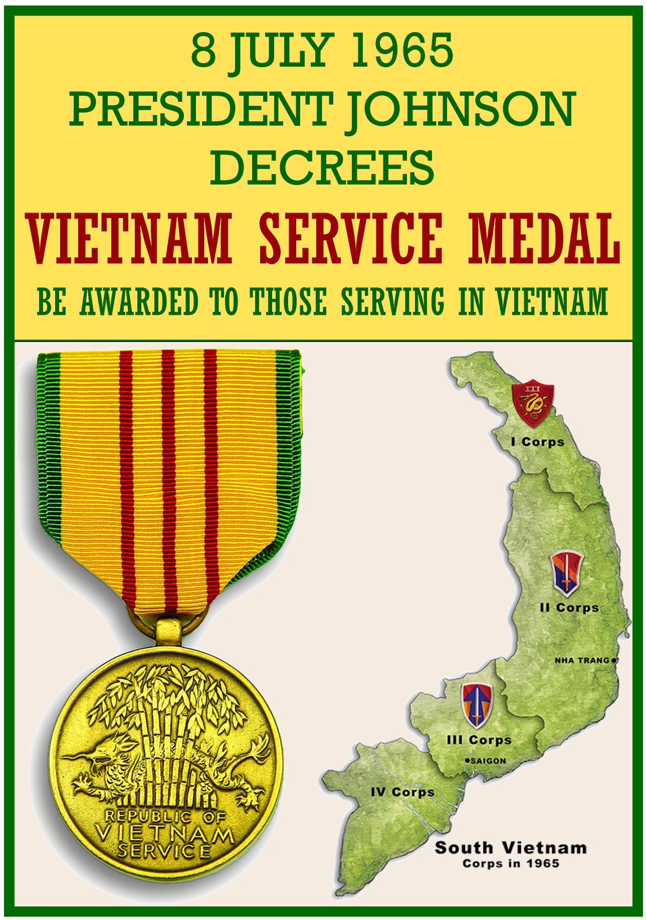 1965 â President Johnson decrees that a Vietnam Service Medal be awarded to Americans serving in Vietnam, even though there had been no official declaration of war. There were 16,300 U.S. troops in South Vietnam at the end of 1964. With Johnsonâs decision to send U.S. combat units, total U.S. strength in South Vietnam would reach 184,300 by the end of 1965.