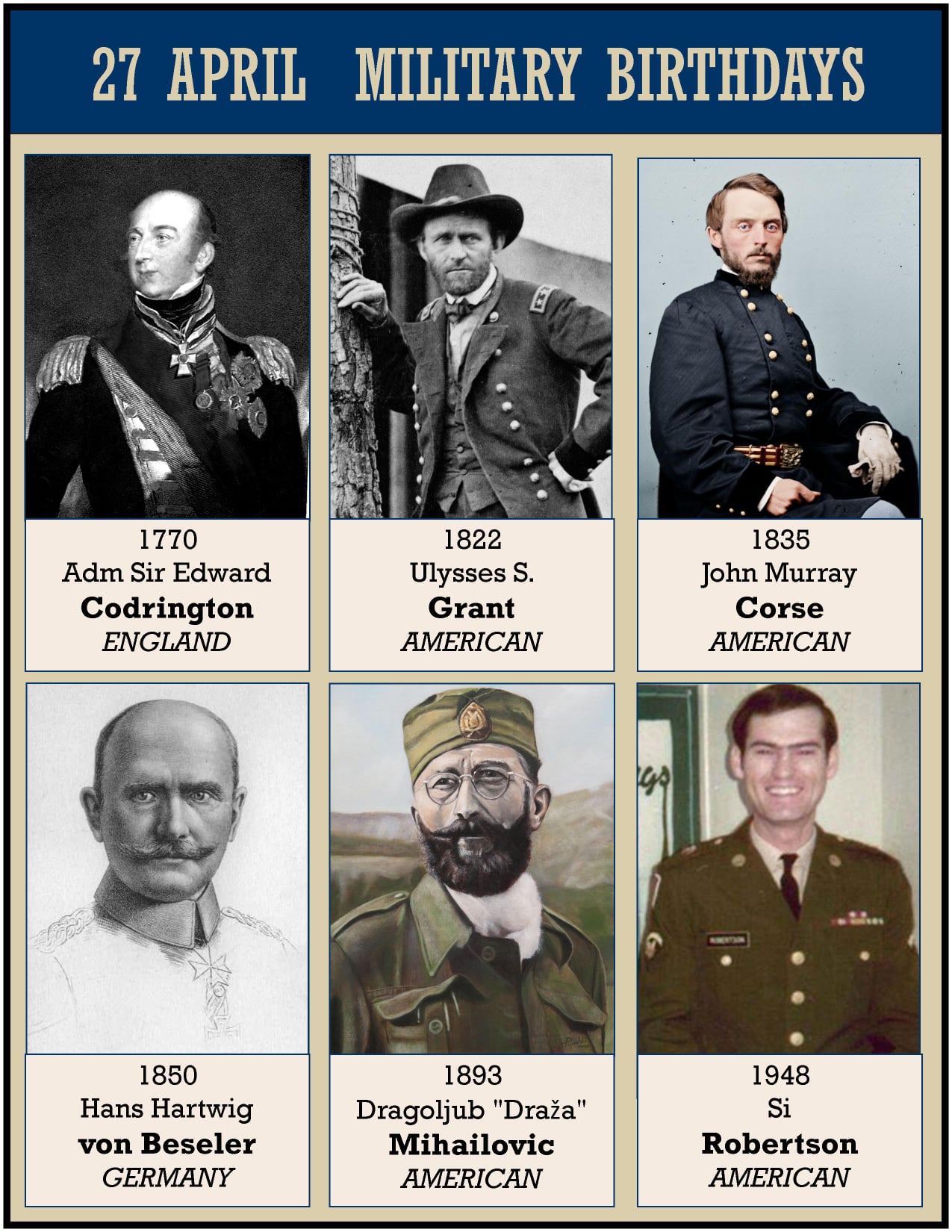 1893 Dragoljub “Draža” MihailoviÄ (Apr 27, 1893 – Jul 17, 1946) was a Yugoslav Serb general during World War II. He was the leader of the Chetnik Detachments of the Yugoslav Army, a royalist and nationalist movement and guerrilla force established following the German invasion of Yugoslavia in 1941.MihailoviÄ went into hiding after the war but was captured in March 1946. He was tried and convicted of high treason and war crimes by the communist authorities of the Federal People’s Republic of Yugoslavia, and executed by firing squad in Belgrade in July. The nature and extent of his responsibility for collaboration and ethnic massacres remains controversial. In May 2015, MihailoviÄ’s verdict was overturned on appeal by the Supreme Court of Cassation of Serbia, citing his trial and conviction as politically and ideologically motivated.