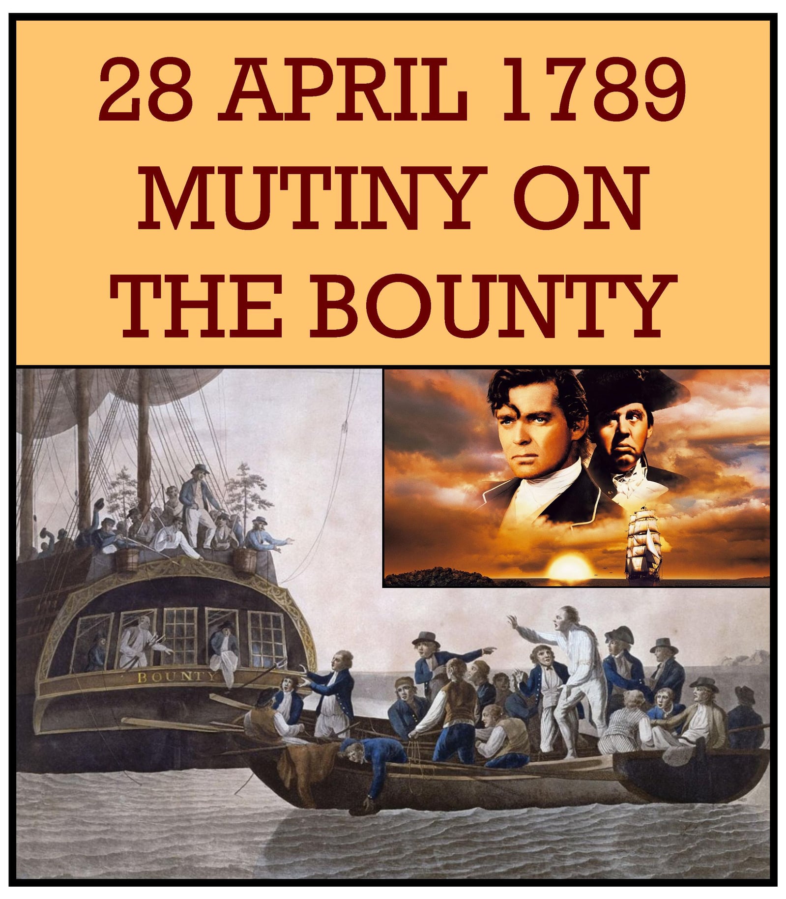 28 APRIL 1789 The mutiny on the Royal Navy vessel HMS Bounty occurred in the South Pacific Ocean on 28 April 1789. Disaffected crewmen, led by acting-Lieutenant Fletcher Christian, seized control of the ship from their captain, Lieutenant William Bligh, and set him and 18 loyalists adrift in the ship’s open launch. The mutineers variously settled on Tahiti or on Pitcairn Island. Bligh navigated more than 3,500 nautical miles (an amazing feat of seamanship)) in the launch to reach safety, and began the process of bringing the mutineers to justice.