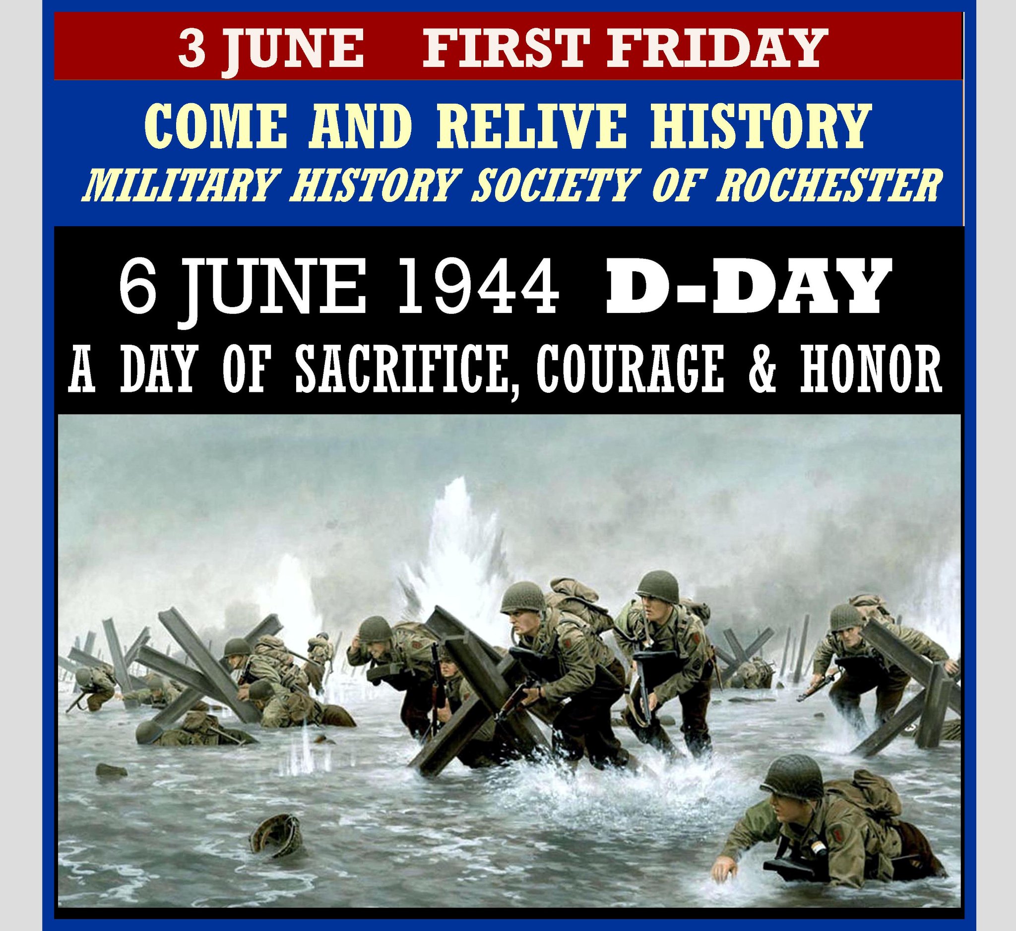 6 JUNE 1944 D-DAY We celebrate D-Day with exhibits that highlight this monumental event. Original artifacts, dioramas, models, newspapers, videos, and photographs take you back to 1944. What was it like to be there? The Military History Society of Rochester honors all who sacrificed to secure our nation from those who would take our freedom.