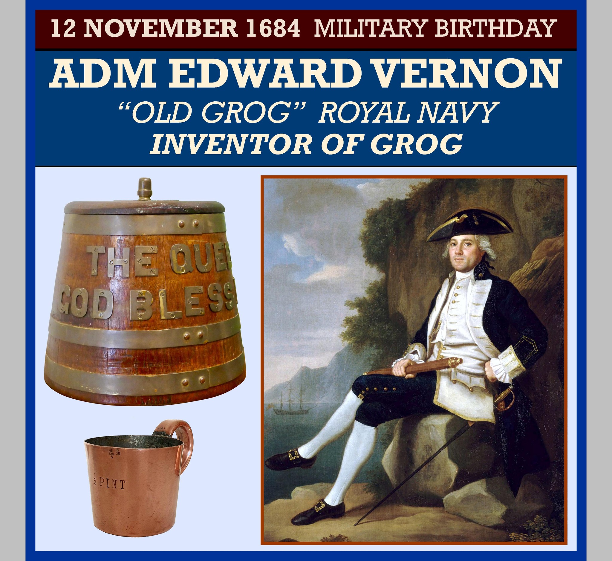 His enduring claim to fame was his 1740 order that his sailors’ rum should be diluted with water. In 1740, The origin of the name “grog” is attributed to Vernon. He was known for wearing coats made of grogram cloth, earning him the nickname of “Old Grog”, which in turn came to mean the diluted rum that he first introduced into his naval squadron.