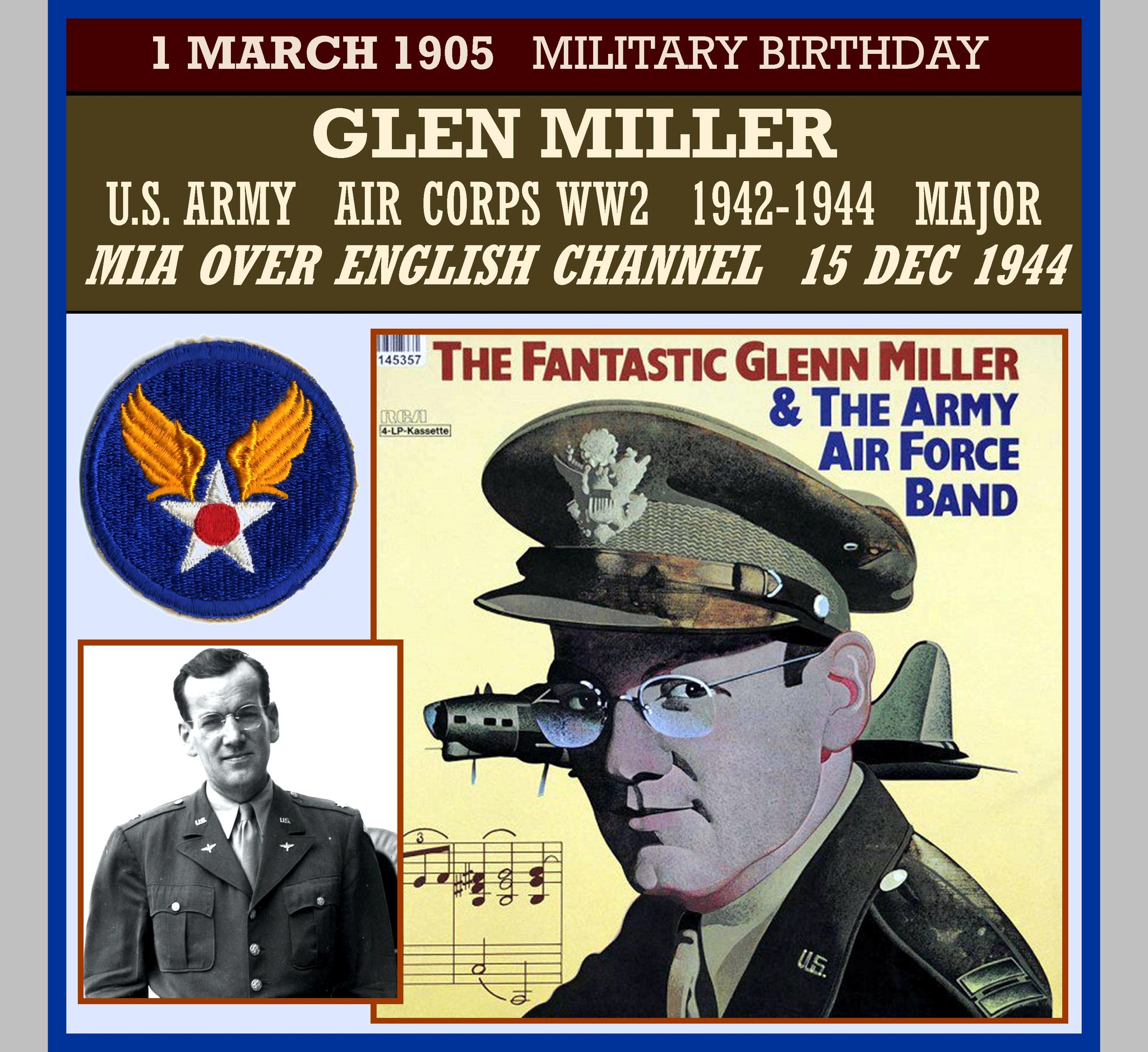 Alton Glen Miller (March 1, 1904 – December 15, 1944) was an American big band founder, owner, conductor, composer, arranger, trombone player, and recording artist before and during World War II, when he was an officer in the US Army Air Forces. Glenn Miller and His Orchestra was one of the most popular and successful bands of the 20th century and the big band era. His military group, the Major Glenn Miller Army Air Forces Orchestra, was also popular and successful.