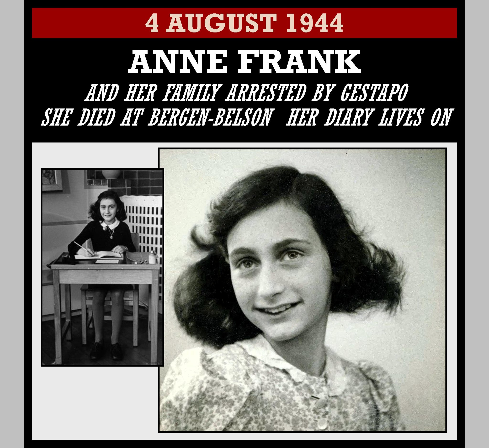 Annelies Marie “Anne” Frank (12 June 1929 – c. February or March 1945)[1] was a German-Dutch diarist of Jewish heritage. One of the most-discussed Jewish victims of the Holocaust, she gained fame posthumously with the 1947 publication of The Diary of a Young Girl (originally Het Achterhuis in Dutch, lit. ‘the back house’; English: The Secret Annex), in which she documents her life in hiding from 1942 to 1944, during the German occupation of the Netherlands in World War II. It is one of the world’s best-known books and has been the basis for several plays and films.