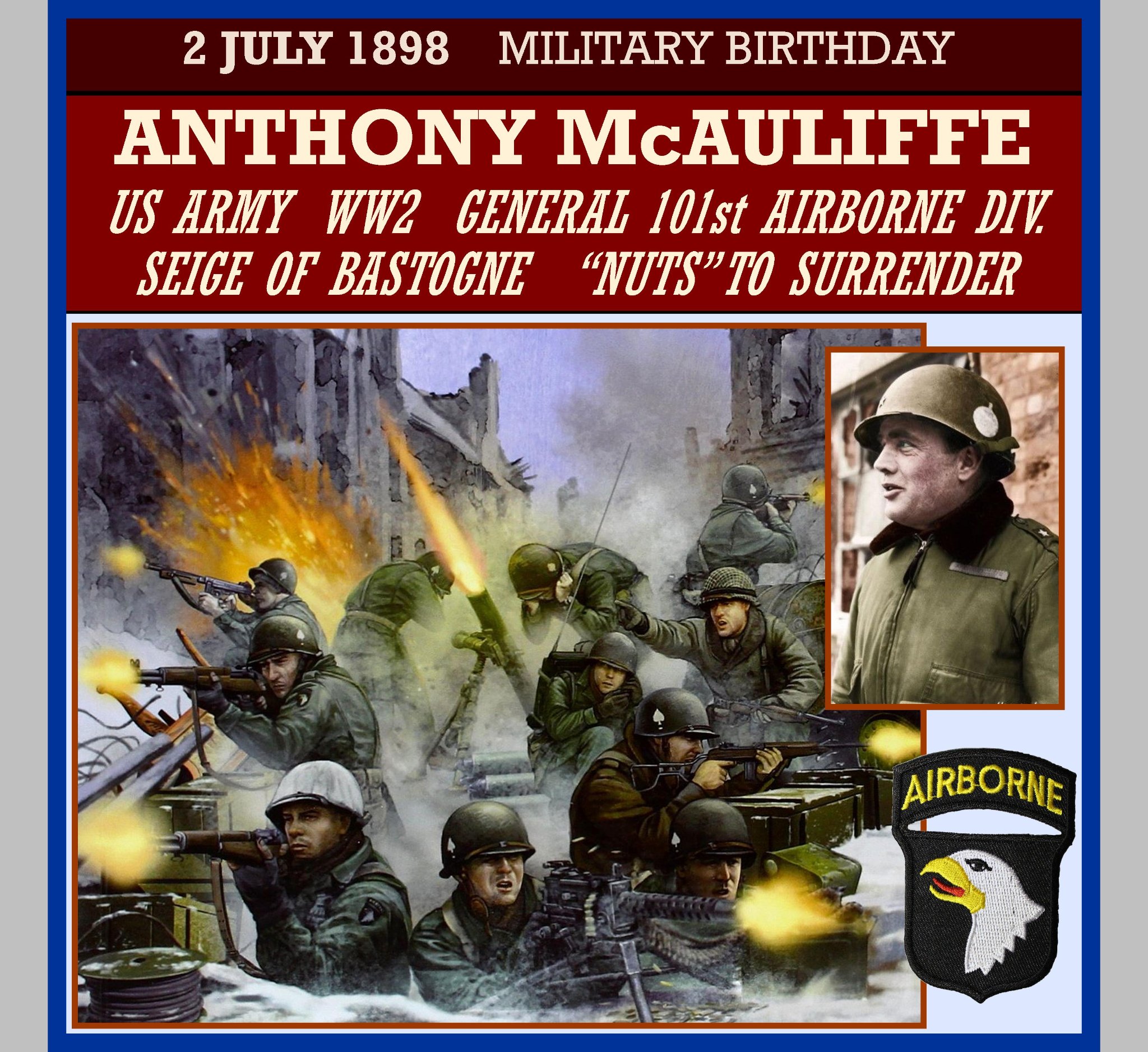 Anthony Clement “Nuts” McAuliffe (July 2, 1898 â August 10, 1975) was a senior United States Army officer who earned fame as the acting commander of the 101st Airborne Division defending Bastogne, Belgium, during the Battle of the Bulge in World War II. He is celebrated for his one-word reply to a German surrender ultimatum: “Nuts!”