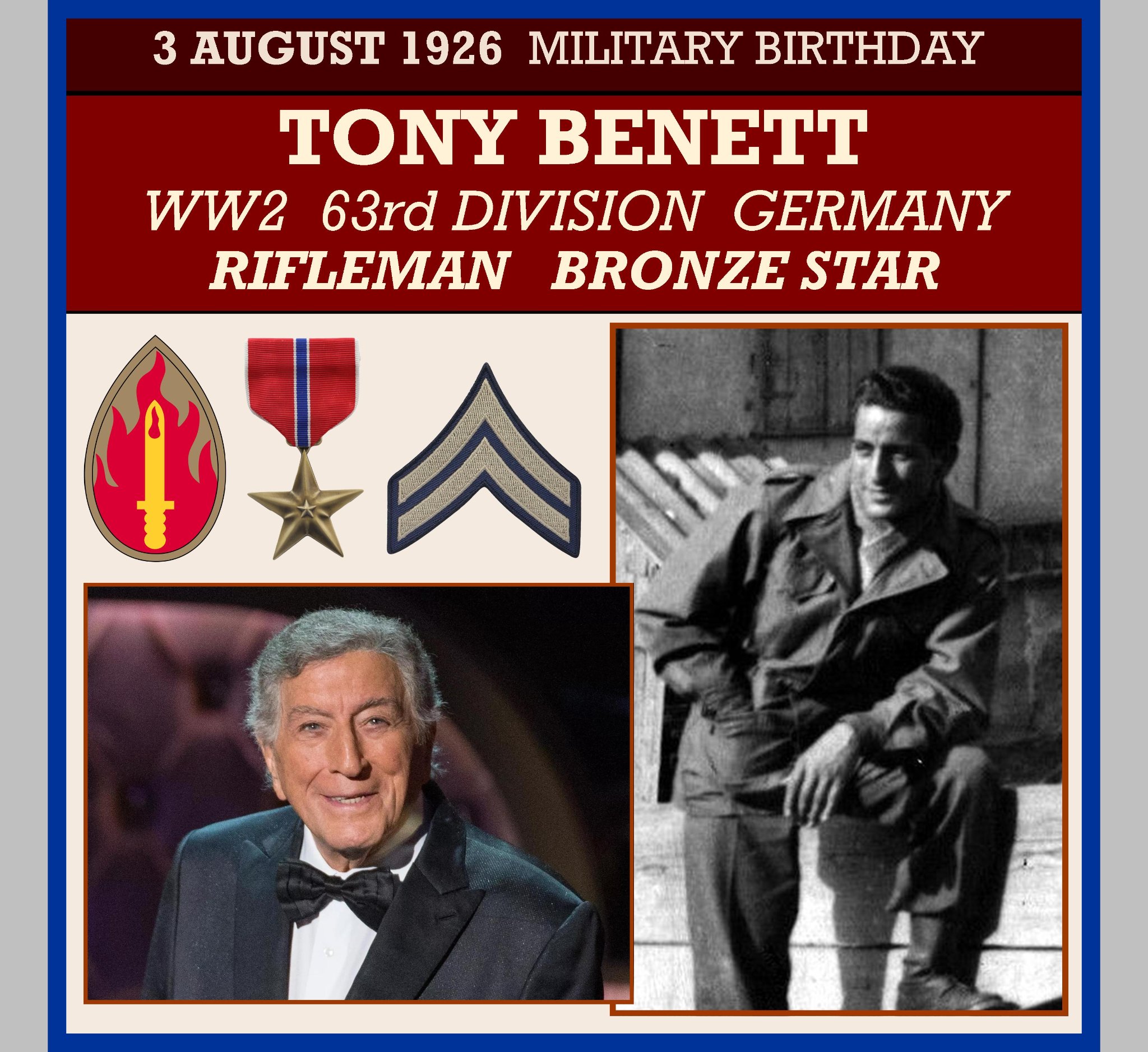 He was stationed in Mannheim, where he counted the days before he could go home to New York. To pass the time, and to forge his craft, Benedetto became part of the informal Special Services band unit, practicing jazz standards and meeting up with other musicians in the US Army. He served until 1946 and was awarded a Bronze Star Medal.