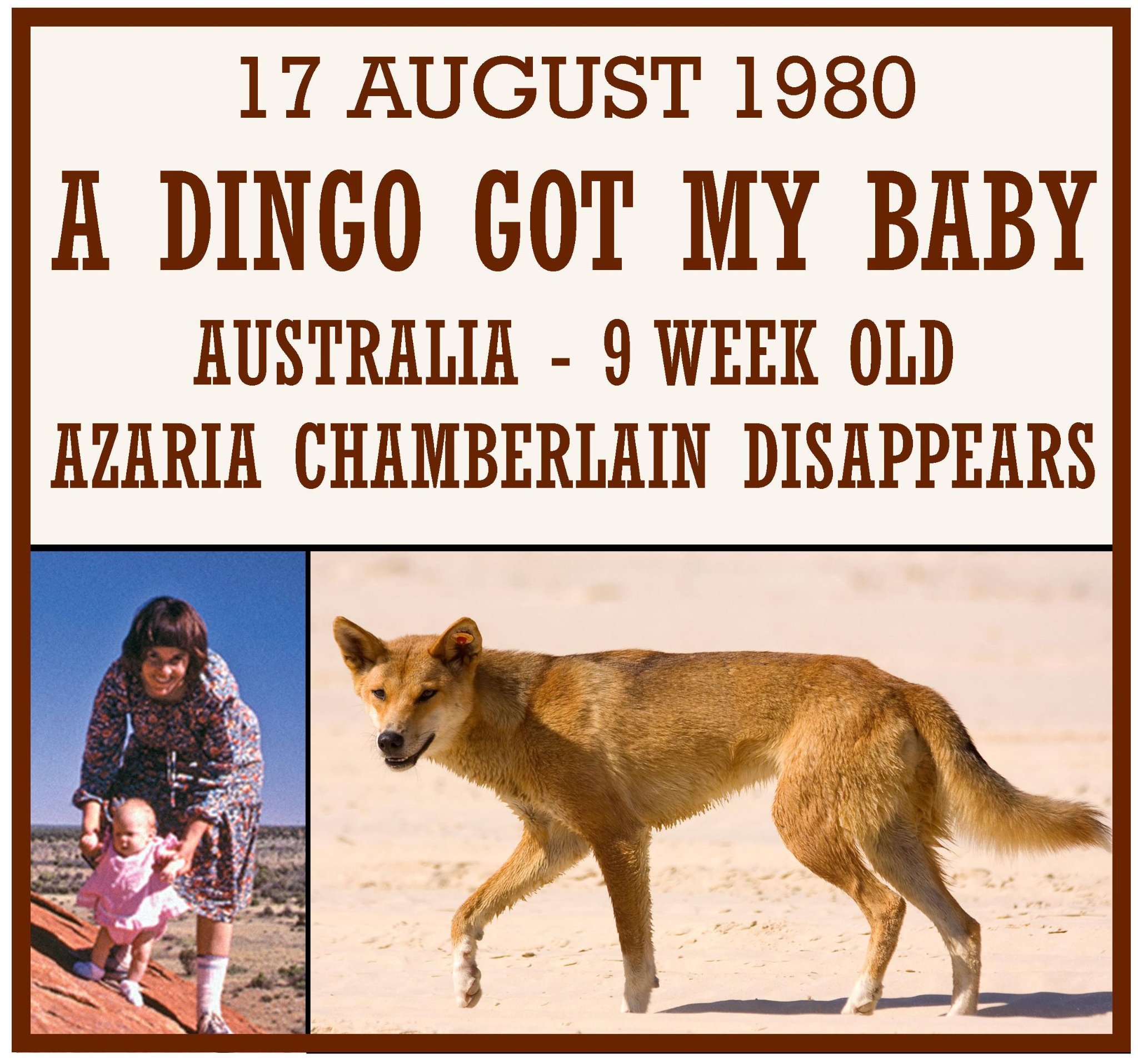 August 17, 1980 Nine-week-old Azaria Chamberlain disappears while she and her parents were tent camping in Australia. Her parents claimed their baby had been taken from their tent by a dingo. Her body was never found. Her mother, Lindy Chamberlain, was tried and convicted for murder and sentenced to life in prison. Azaria’s father, Michael Chamberlain, was convicted as an accessory after the fact and given an 18-month suspended sentence. Lindy was released after a piece of Azaria’s clothing was found near a dingo lair in 1986. She had spent more than three years in prison. In 1988, all convictions against Lindy and Michael Chamberlain were overturned. Lindy Chamberlain was paid $1.3 million for false imprisonment; however, this was less than one third of their legal expenses. In 2012, 32 years after Azaria’s death, the Chamberlains’ version of events was officially supported by a coroner.
