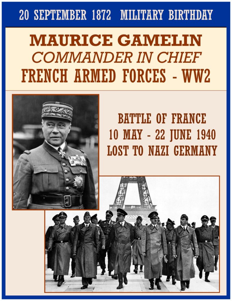 Maurice Gustave Gamelin (20 September 1872 â 18 April 1958) was an army general in the French Army. Gamelin is