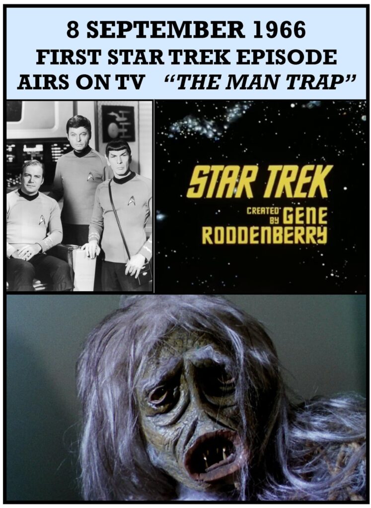 NBC airs Star Trekâs first episodeâ”The Man Trap”âat 8:30PM on September 8, 1966.[28] “Where No Man…”, which eventually aired in