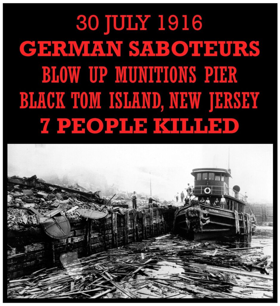 1916 â German saboteurs blew up a munitions pier on Black Tom Island, Jersey City, NJ. 7 people were killed.