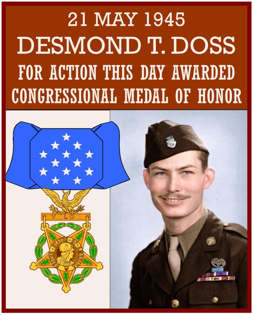 Citation: Private First Class Desmond T. Doss, United States Army, Medical Detachment, 307th Infantry, 77th Infantry Division. Near Urasoe-Mura, Okinawa,