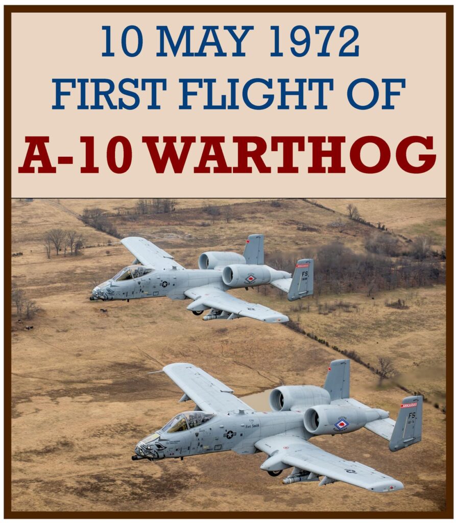 1972 â First flight of the Fairchild Republic A-10 Thunderbolt II (a.k.a. âWarthogâ). The Fairchild Republic A-10 Thunderbolt II is