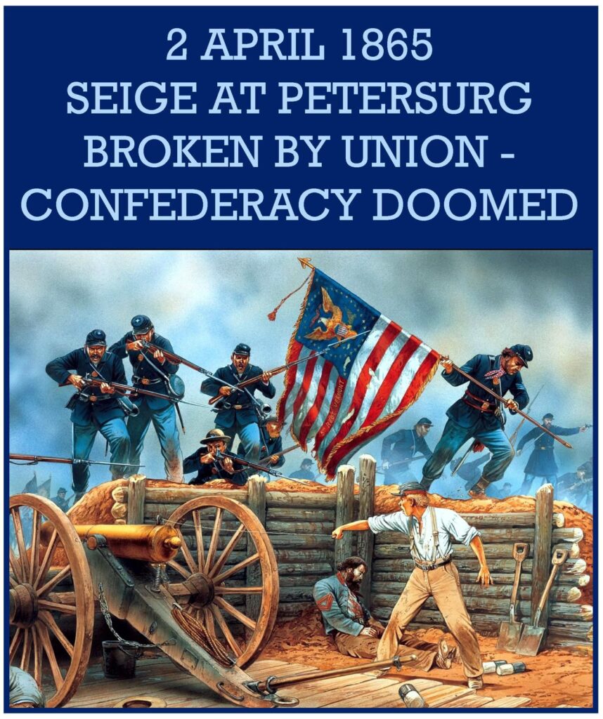 1865 â After a ten-month siege, Union forces under Ulysses S. Grant capture the trenches around Petersburg, Virginia, and Confederate