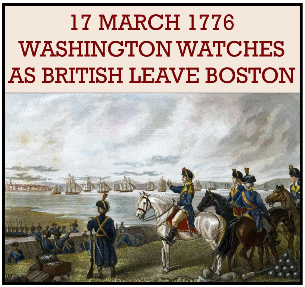 1776 â During the American War for Independence, British forces are forced to evacuate Boston following Patriot General George Washingtonâs