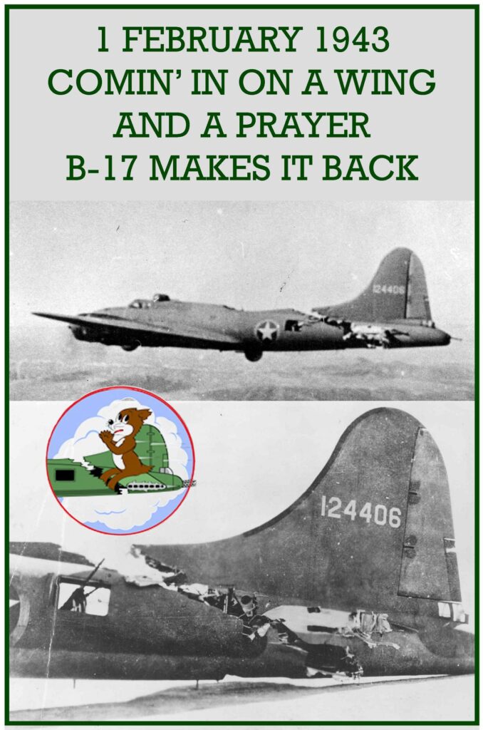 Comin’ in on a Wing and a Prayer February 1, 1943 The U.S. Air Force bomber All American’s tail is