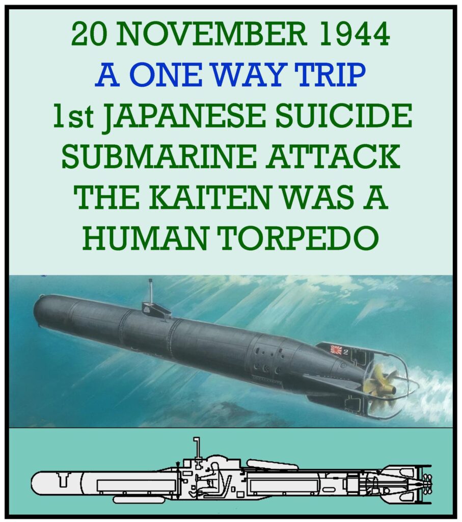 1944 â The 1st Japanese suicide submarine attack was at Ulithi Atoll, Carolines. A Japanese Kaiten attack sinks the US