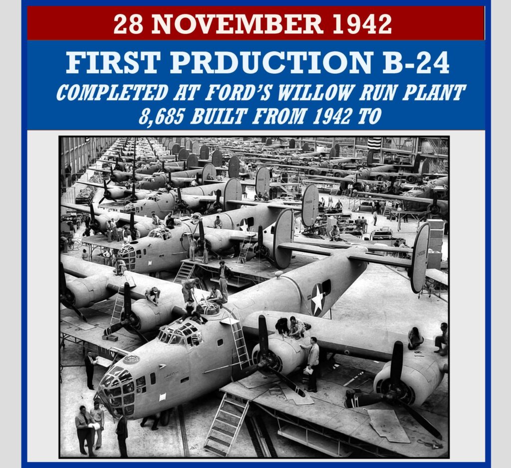 1942 â The first production Ford bomber, the B-24 Liberator, rolled off the assembly line at Fordâs massive Willow Run