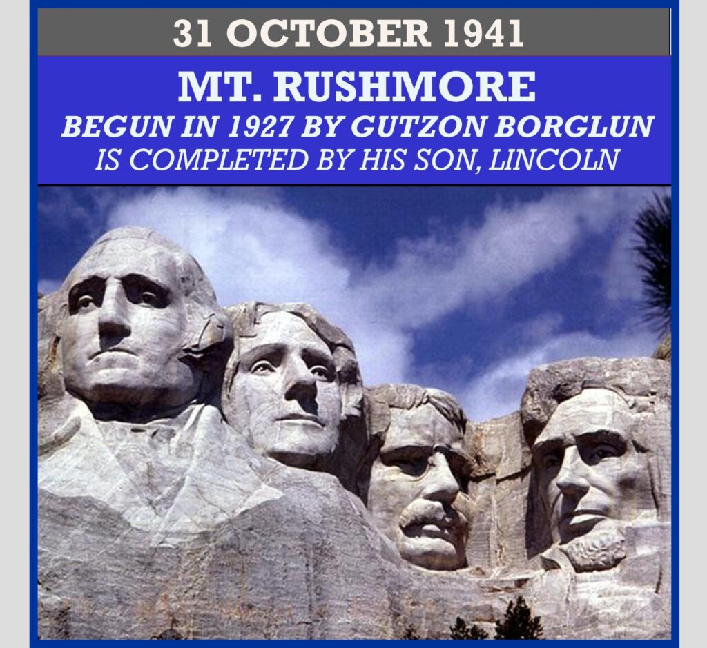 Mount Rushmore October 31, 1941 The Mount Rushmore memorial is completed. Work had begun in 1927 by sculpture Gutzon Borglum