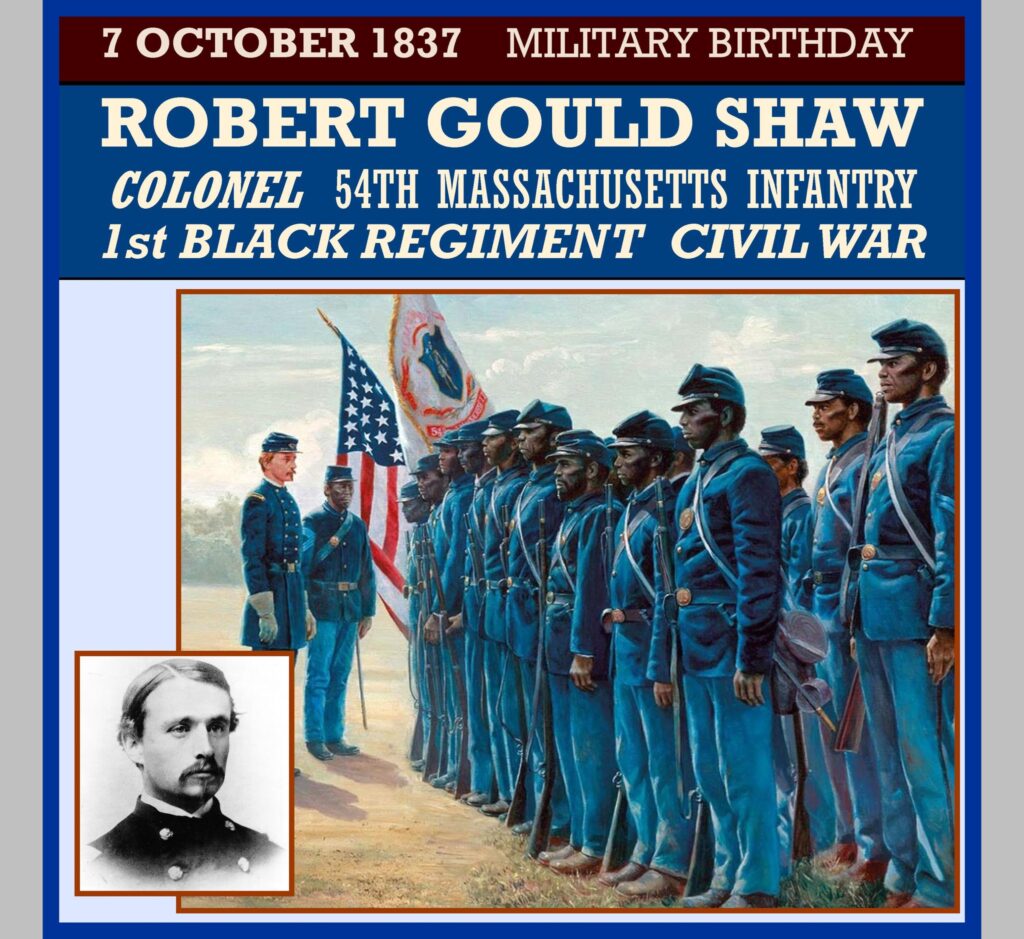 1837 â Robert Gould Shaw was born to a prominent abolitionist family. He became commander of the 54th Massachusetts Regiment,