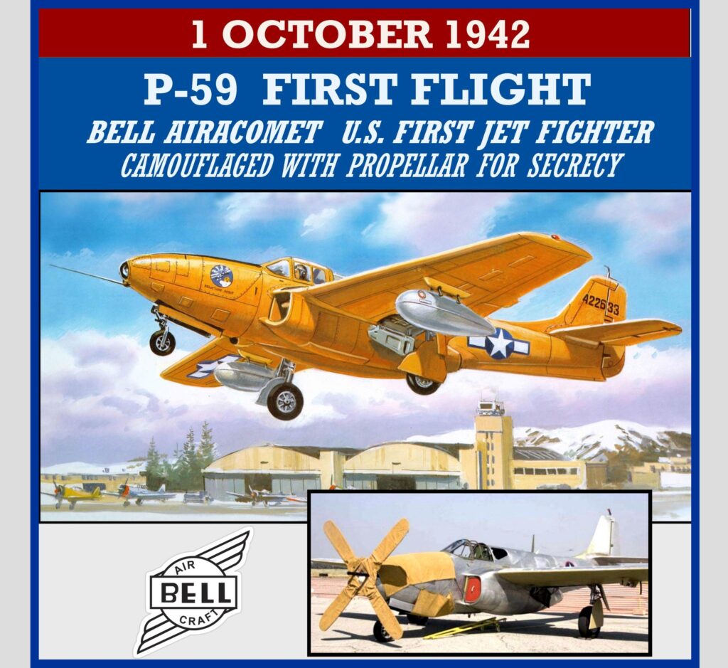 1942 â First flight of the Bell XP-59 âAiracometâ. The Bell P-59 Airacomet was the first American jet fighter aircraft,