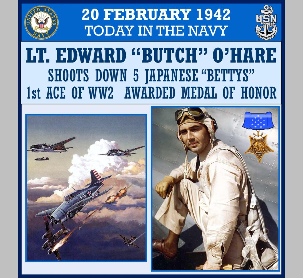 1942 â Lt. Edward OâHare takes off from the aircraft carrier Lexington in a raid against the Japanese position at