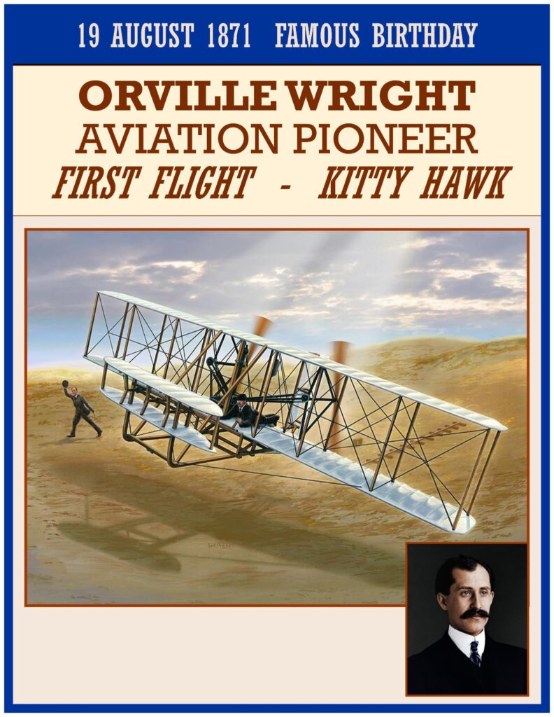 The Wright brothers â Orville (August 19, 1871 â January 30, 1948) and Wilbur (April 16, 1867 â May 30,