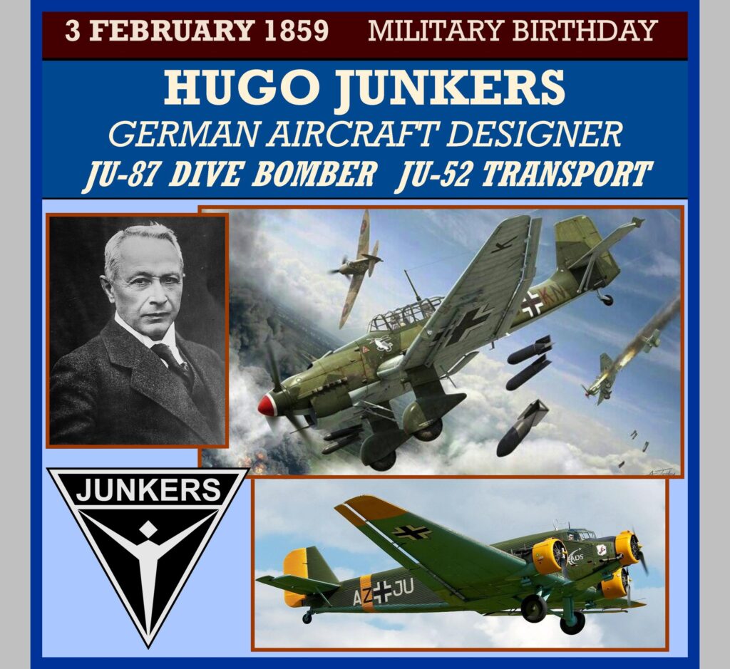 Hugo Junkers (3 February 1859 â 3 February 1935) was a German aircraft engineer and aircraft designer who pioneered the
