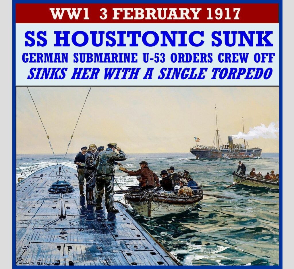 On February 3, 1917, SS Housatonic was enroute from Galveston Texas to Liverpool England bearing a cargo of flour, and