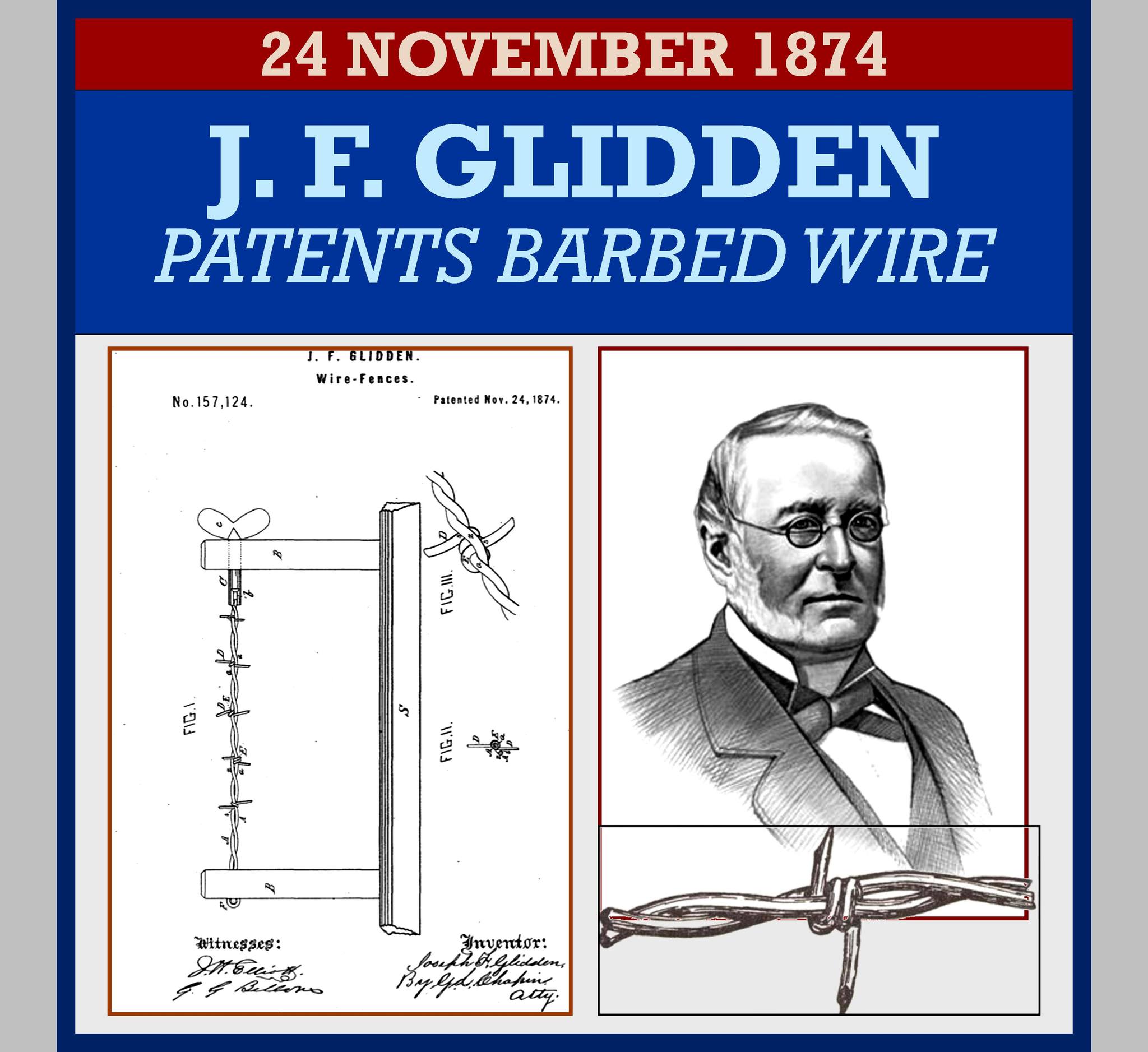 The first patent in the United States for barbed wire was issued in 1867 to Lucien B. Smith of Kent, Ohio, who is regarded as the inventor. Joseph F. Glidden of DeKalb, Illinois, received a patent for the modern invention in 1874 after he made his own modifications to previous versions.