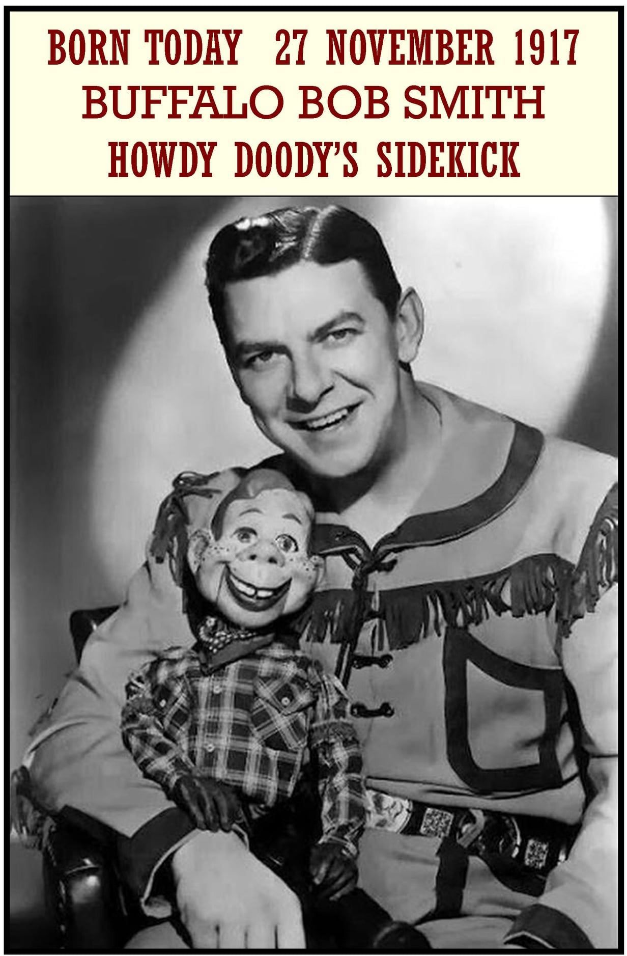 Beloved pioneer TV kids’ show host, Buffalo Bob Smith was the co-creator and host of TV’s Howdy Doody (1954) for almost its entire thirteen-year run (NBC: 1947 – 1960), being sidelined for a little less than a year by a near-fatal heart attack in 1954. With his open, friendly personality, combined with the antics of the show’s puppet and human casts, he won over the hearts of America’s baby-boomer children easily, a hold he retains in spirit to this day. After a decade of semi-retirement following the show’s cancellation in September 1960, Bob Smith made a huge comeback on the college campus circuit in the early 1970s, including a sold-out engagement at New York City’s legendary rock palace, “The Fillmore East”. rochestermilitary.com