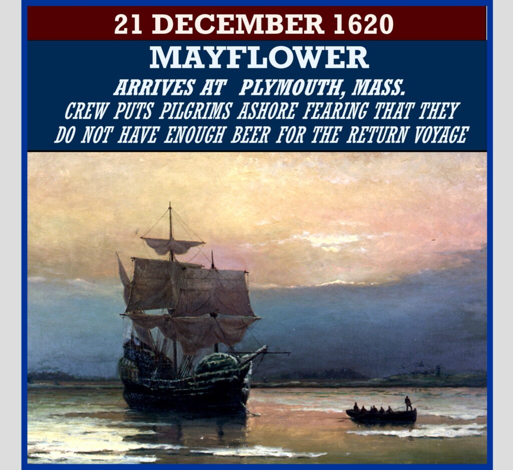 1620 â The Mayflower reached Plymouth, Mass. after a 63-day voyage. Pilgrims aboard the Mayflower went ashore for the first