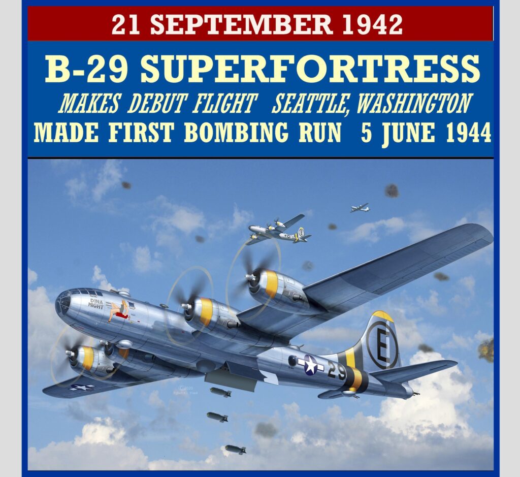 1942 â The U.S. B-29 Superfortress makes its debut flight in Seattle, Washington. It was the largest bomber used in