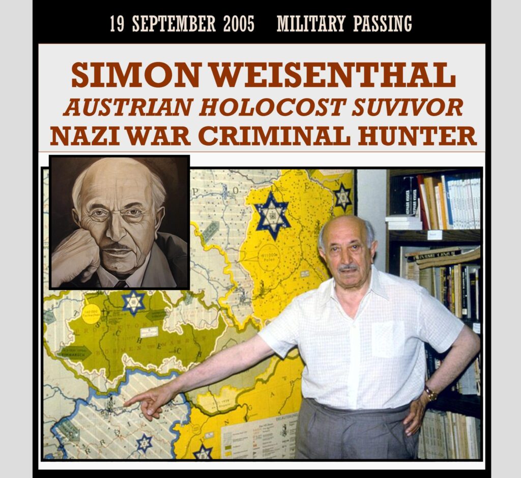 Simon Wiesenthal KBE (31 December 1908 â 20 September 2005) was a Jewish Austrian Holocaust survivor, Nazi hunter, and writer.